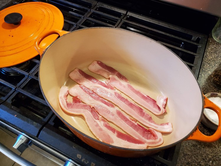 I’ve invested in a bunch of enameled cast iron cookware, mostly bought either second-hand or from outlet stores on discount. I love this stuff, and this soup is a showcase for why. Step one, render the bacon: