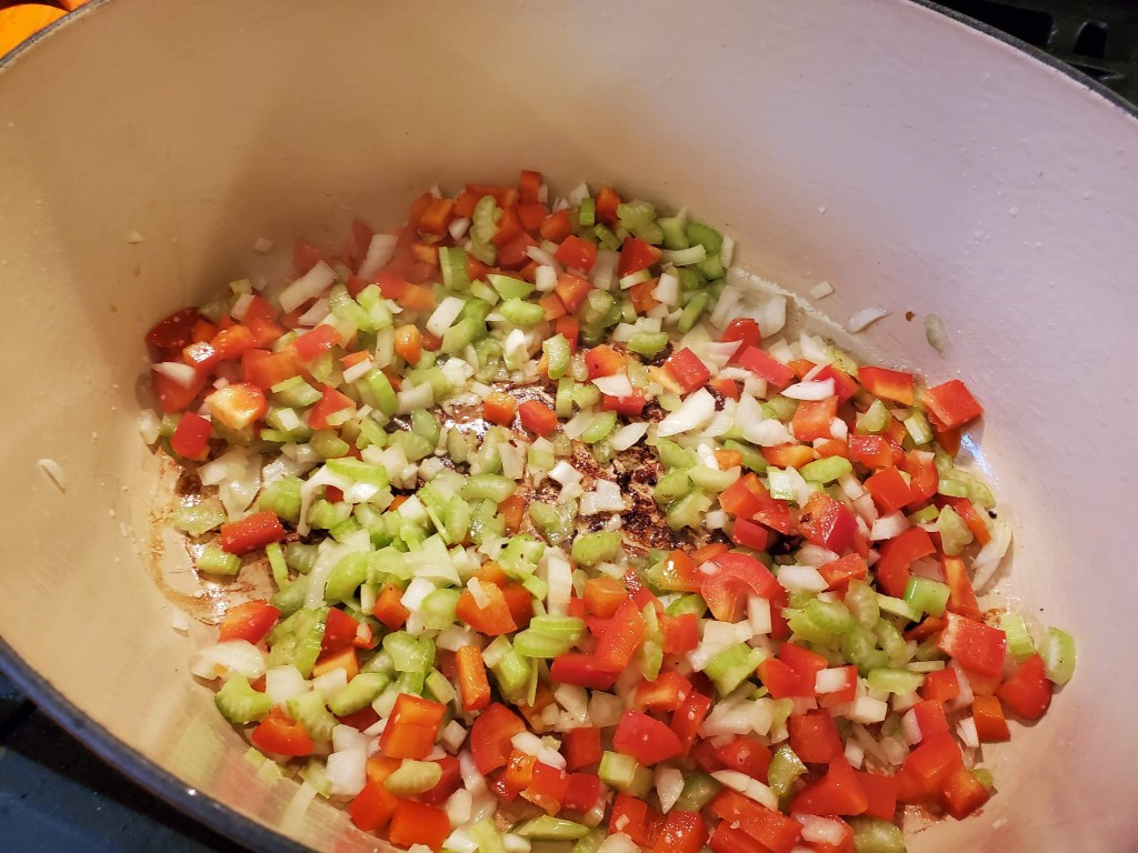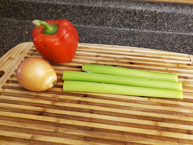 While that’s going on low heat, dice up your aromatics. The combination of bell pepper, onion, and celery is actually a cajun standard they call the Holy Trinity. It’s an adjustment from the classic French mirepiox, which has carrot in place of the bell pepper. Anyway, here’s what it looks like:
