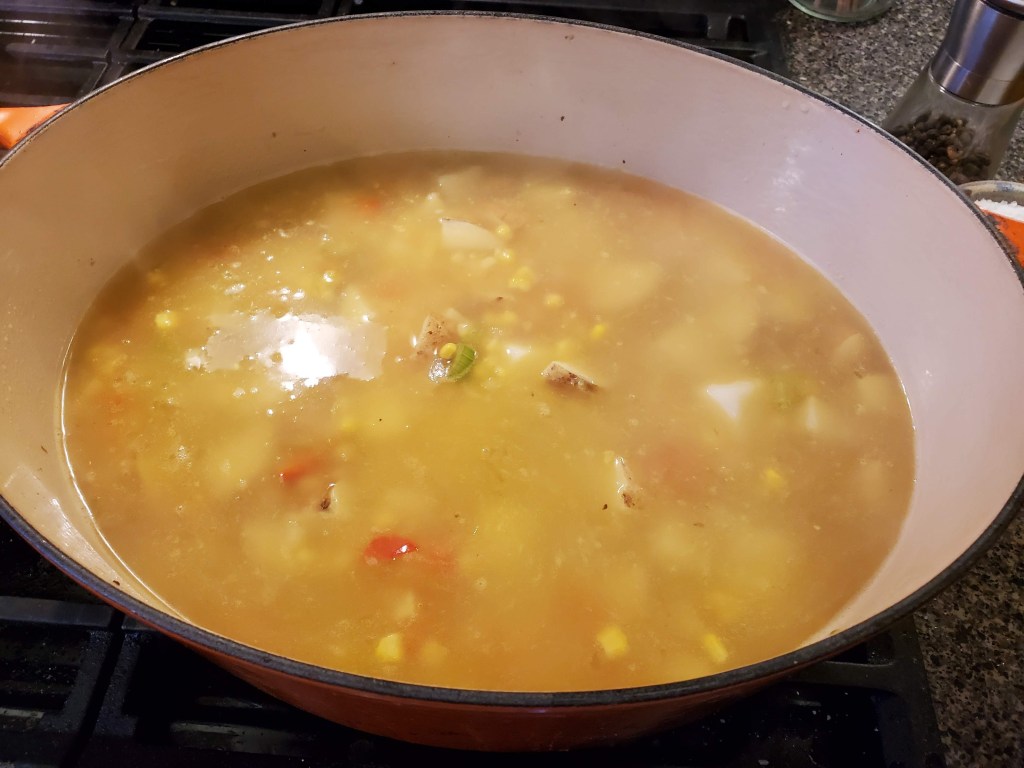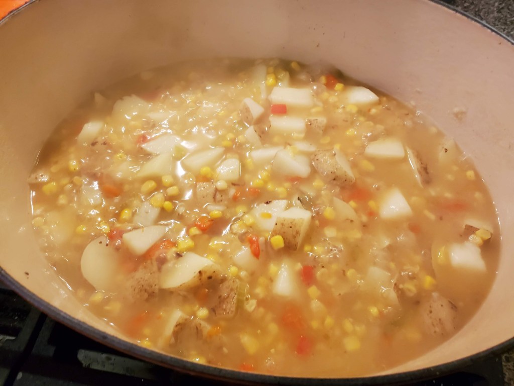 Method: In the bottom of a large dutch oven or sauce pot, render the bacon on low heat until crispy. Remove, and set aside. Dice the onion, pepper, and celery, and sweat in the rendered bacon fat with a little salt to help the process. Add corn and potatoes, cover with stock or water and simmer until potatoes are done. Add whole milk to desired level, and add salt and pepper to taste. Garnish with crispy bacon and green onion.