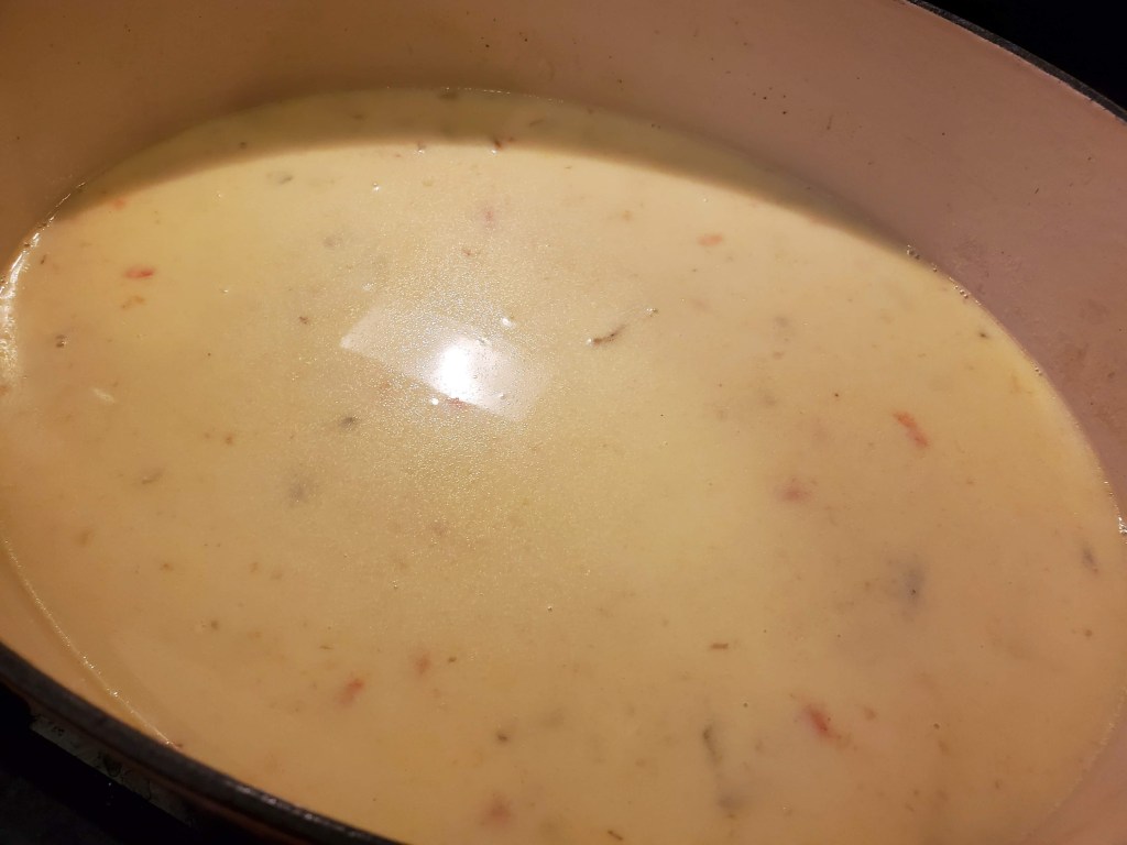 From here, it’s almost autopilot. Cover the mix with either water or (if you prefer) chicken stock. My only caution is using stock is going to add a goodly dose of fat, in a dish that already has bacon and whole milk, so… you do you. Cover and simmer until the potatoes are fork-tender:
