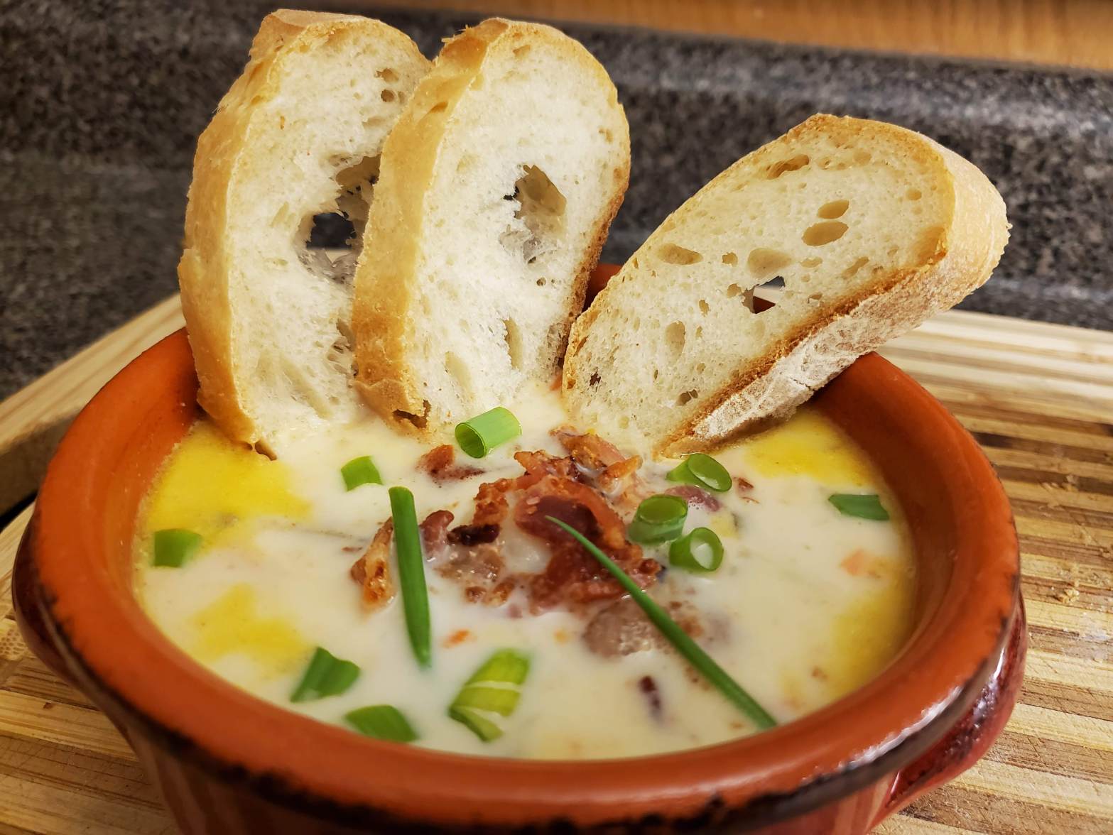 Plate it up with the crispy bacon we cooked earlier, and some green onion. Extra great with some pilot or oyster crackers, or a crusty baguette (also homemade, but that’s a different post):
