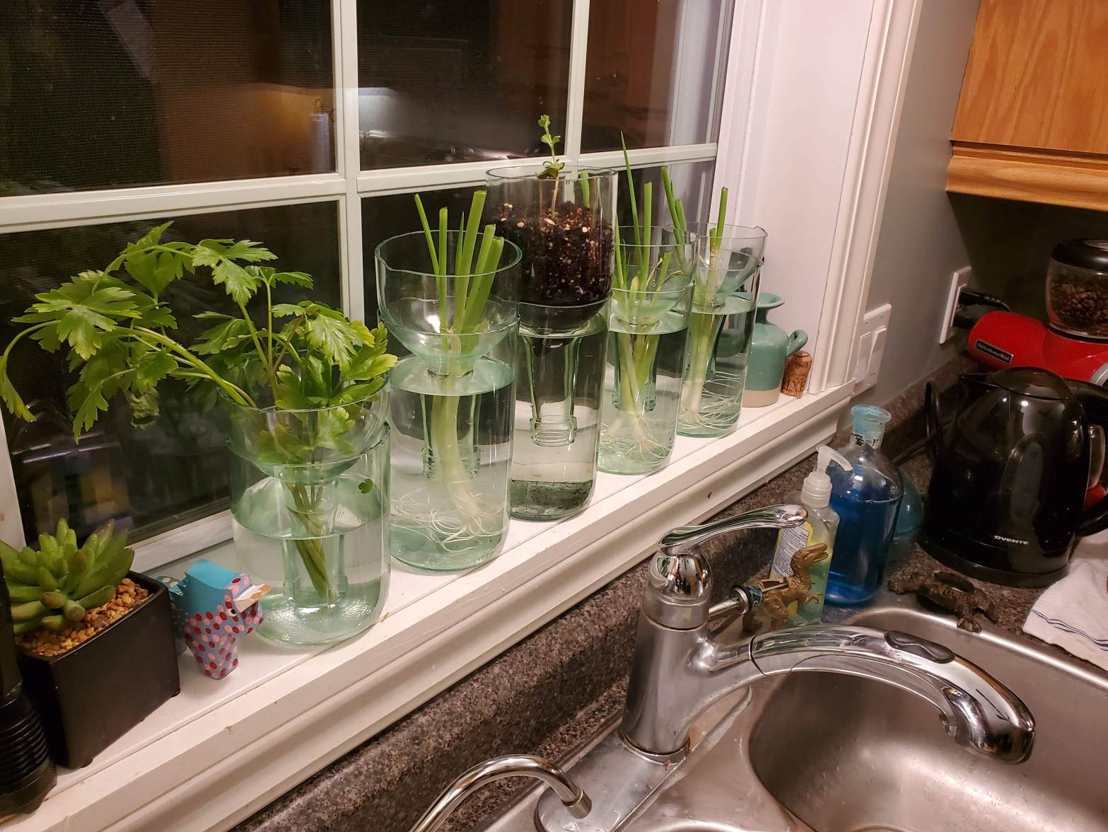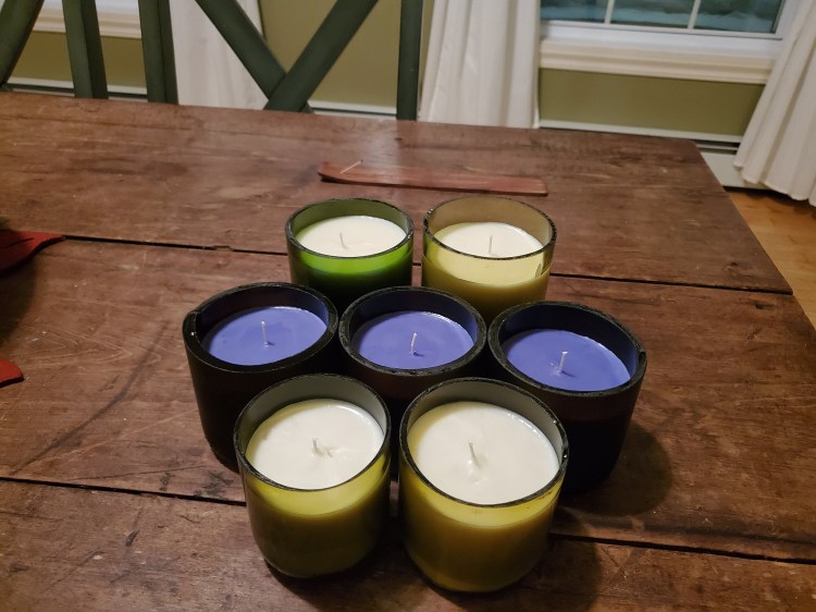 This is a winter-in-Maine garden of green onions, parsley, and the experiment in the middle is mint from the yard that the wife picked in the dead of January (it’s actually taken root, and is somehow doing great despite my many eye-rolls). Moving on, all of those planters are old wine bottles that we cut in half. Similarly, some additional uses thus far: