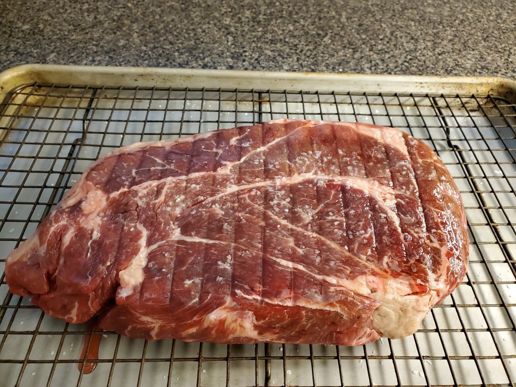 Step one: salt your meat. I like to do this on a wire rack over a cookie sheet, but anything that has enough space to catch a little runoff will work just fine. Using kosher salt, season the roast liberally on both sides, and let it sit for at least an hour (or overnight) in the fridge.