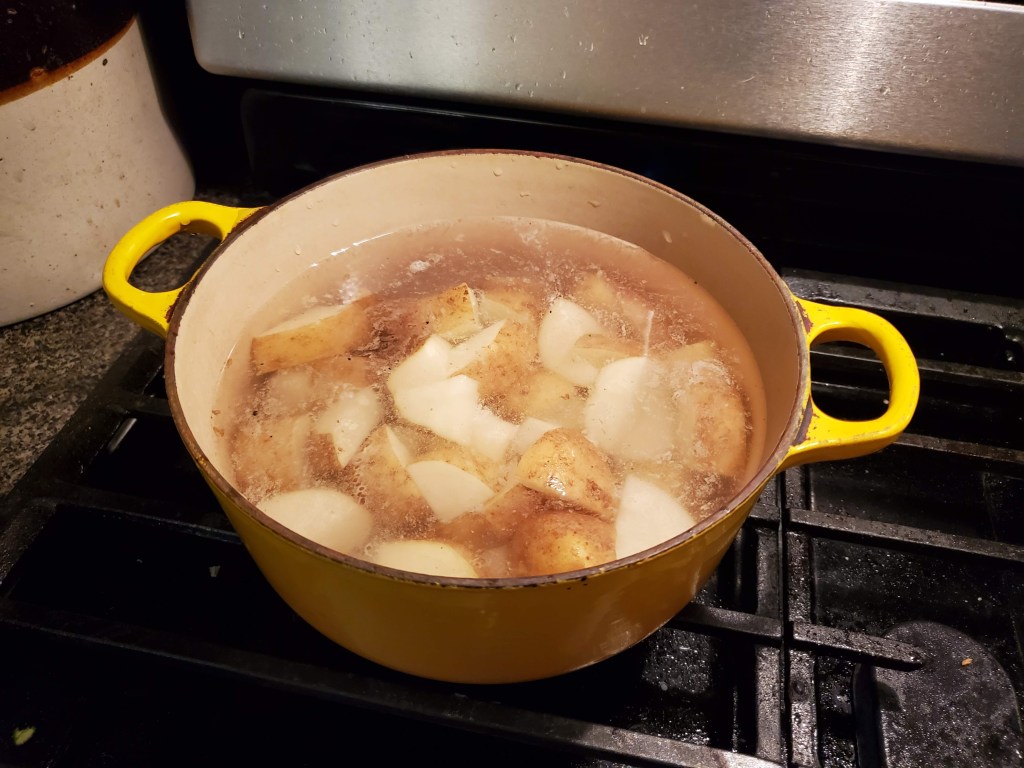 And boil ’em in salted water until they’re fork tender. Then drain them and wait for backup.
