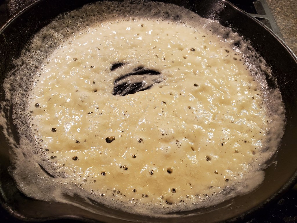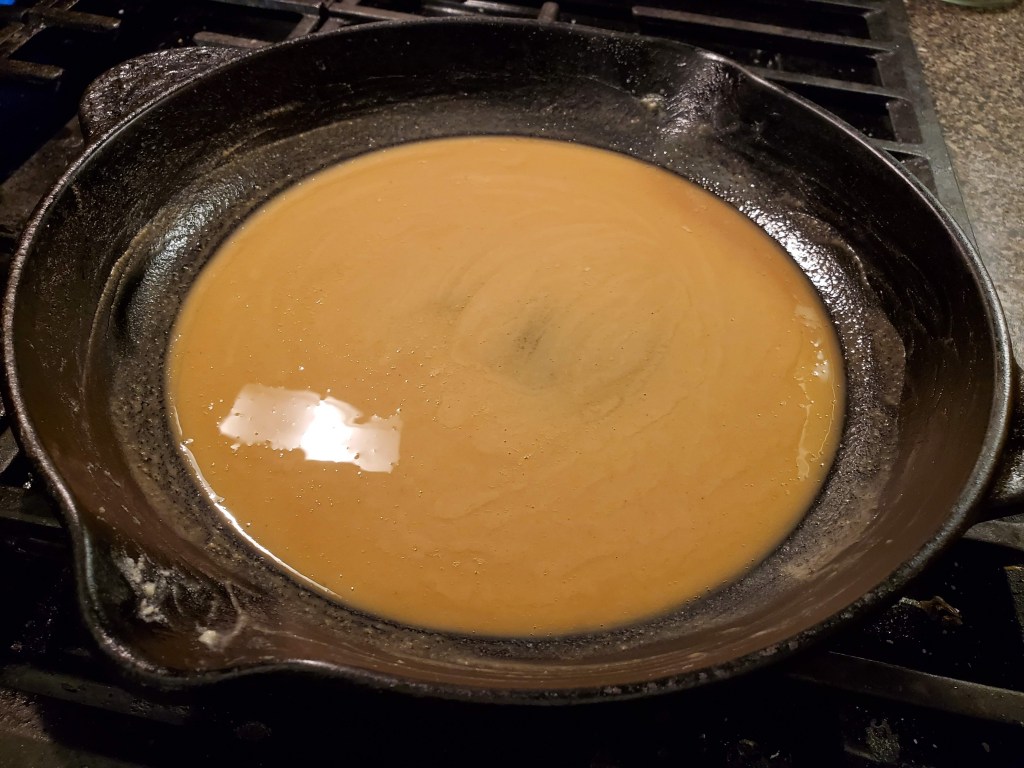 I use a cast iron skillet, because I like the heat retention, and it’ll stand up to the abrasive whisking that’s about to take place. You can use stainless as well, but avoid non-stick at all costs here, and really, I wouldn’t use enameled cookware either, if only for the metal contact.
