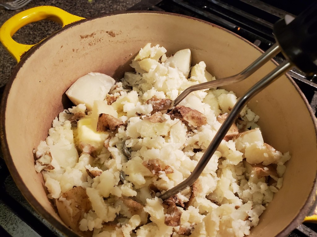 Per the Mrs., keep adding butter and milk until you have the desired consistency, understanding that each liquid addition will temporarily get soupy, then will tighten back up. She also cautions to GO SLOW with these additions to avoid the potato swamp issue I’ve been repeatedly reminded of with a well-deserved scowl.
