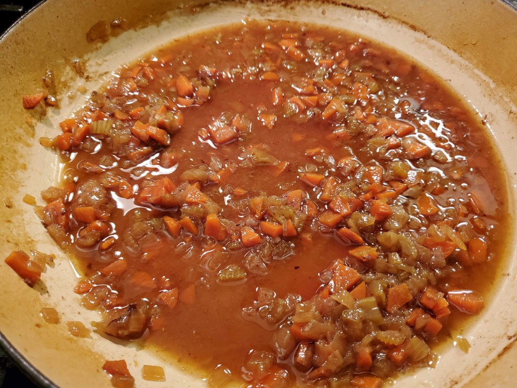 Sweat until the mirepoix gives up its liquid and softens, which in turn should loosen up some of the fond on the pan. Add the vermouth and the Worcestershire, give it a good stir to make sure all the bits are up off the bottom, replace the roast, and get it in the oven at 225F: