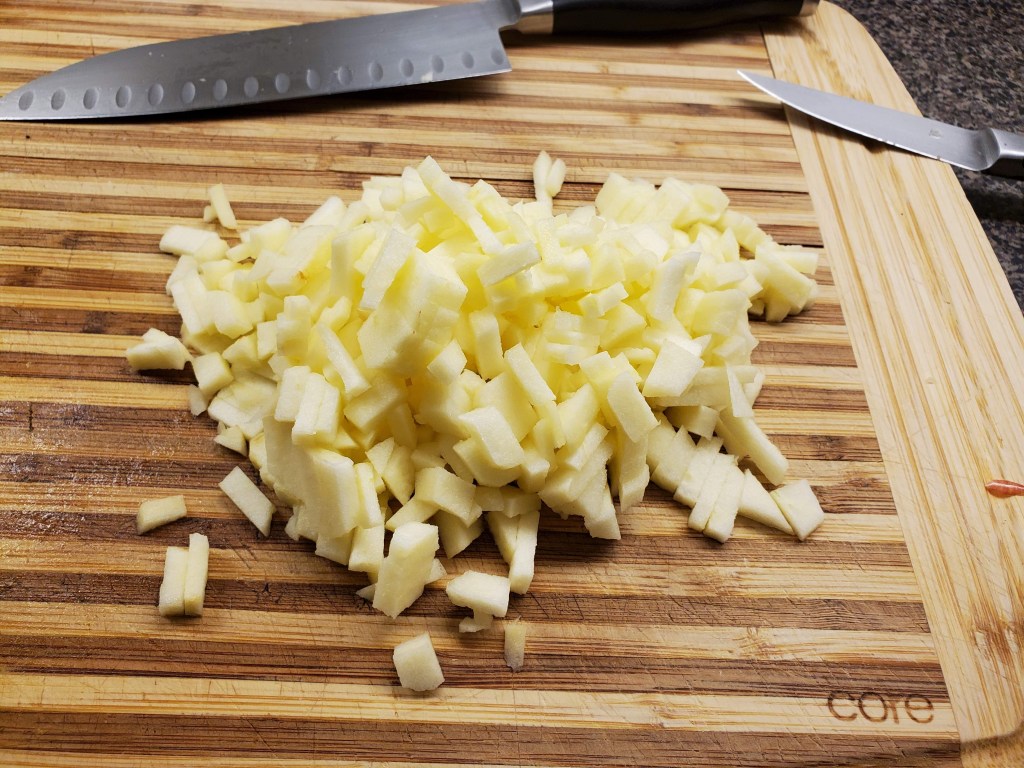 Step one: Peel and dice your apples, and get them into a medium-sized bowl: