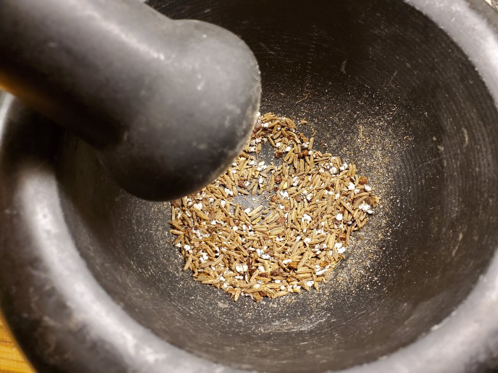 As for the grains of paradise, they’re not absolutely necessary, but I find they add a peppery brightness that’s hard to reproduce. If you’re using them, grind them in a mortar and pestle before you add the caraway: