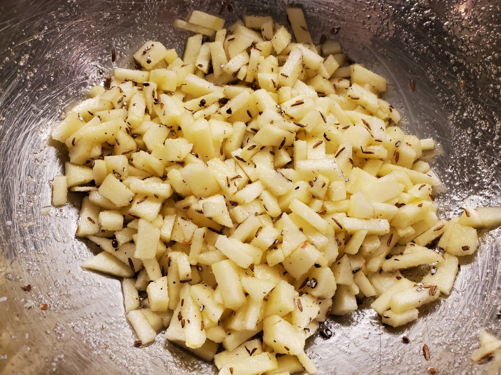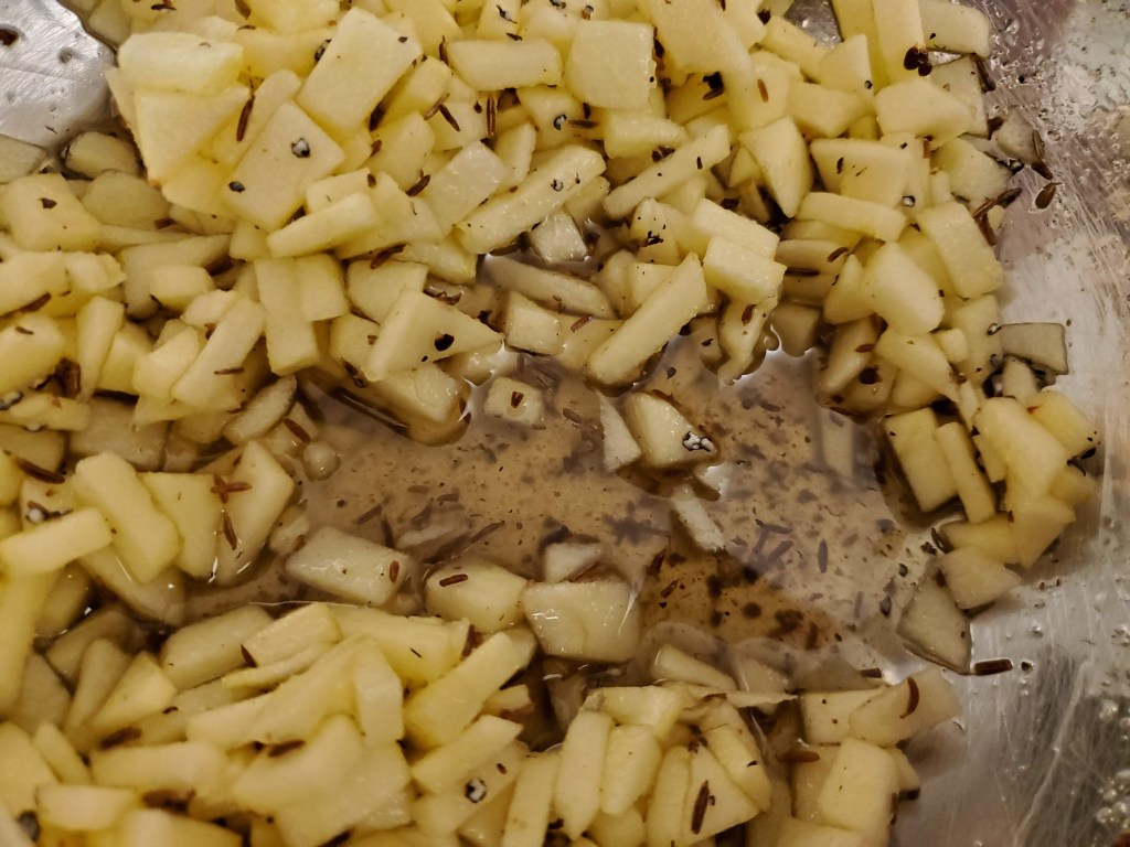 Step three: the spices. My all-time favorite spice with apple is caraway, and I use it here in freshly-cracked form. I don’t grind it into a powder because the seeds actually provide a poppy-like crispy crunch in the final product that’s really fantastic, and discovered completely by accident.
