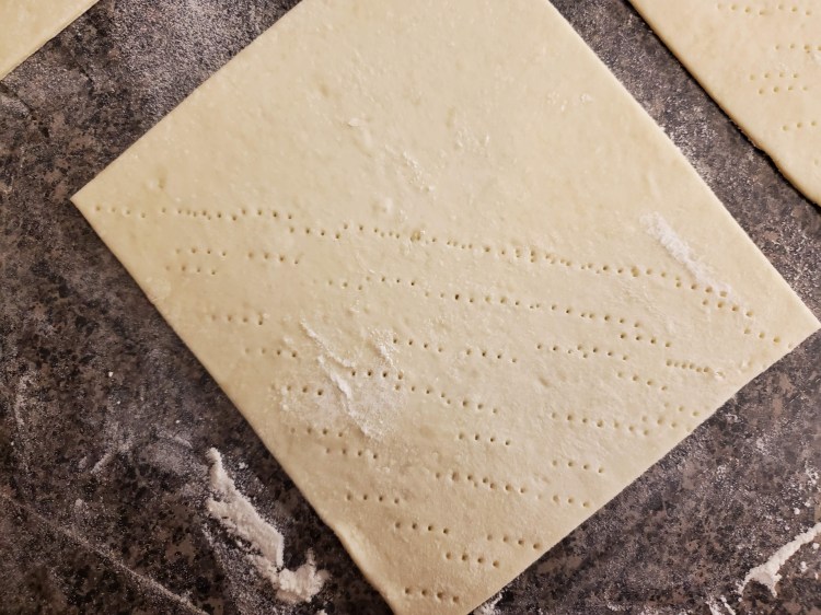 Step four: roll your dough out, cut it, and dock the bottom half. If you’ve read the pot roast dinner turnover post, it’s the same drill: