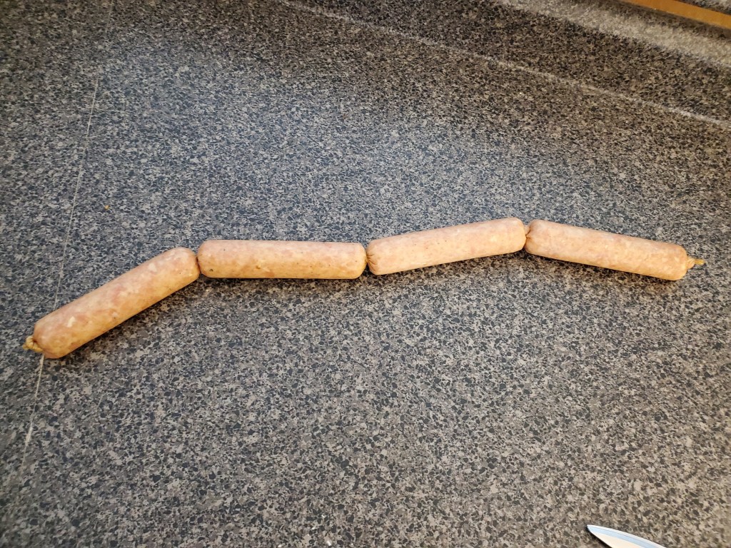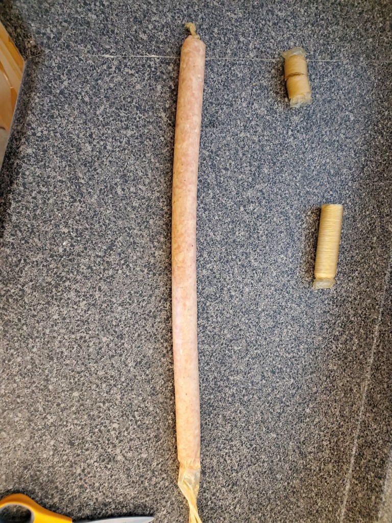 As to the process, it’s pretty simple and there (again) are a lot of videos out there showing the whole thing, but slide the casings onto the nozzle, and start running the sausage through the machinery. As it fills the casing, just keep things moving and let the machine do the work until you have one big sausage: