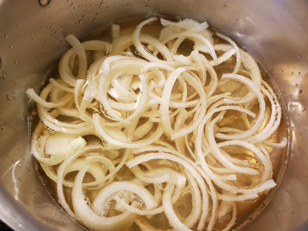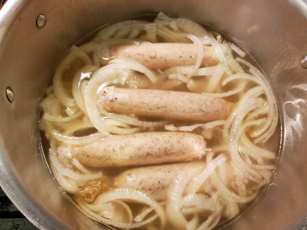 So cooking… as I mentioned, these casings need an application of high, dry heat at some point, whether that’s a broiler or a skillet or a charcoal grill. But, before we get there, let’s talk about adding even more flavor. With onions. And beer.