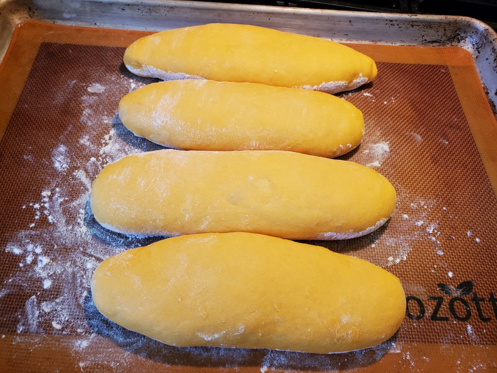 Step two: divide and shape. As I mentioned, you can really do whatever you want with it at this point, including one big loaf. We’re doing those sausages, so I went for foot-long buns: