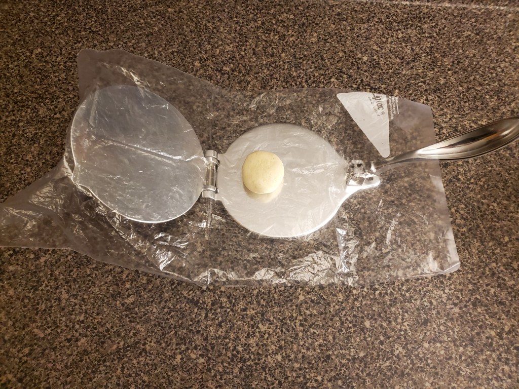 Step two: press your tortillas. The press I bought is cast aluminum, and very light. A lot of the reviews hammer this point as a negative, but look, you’re not trying to flatten the Hope Diamond. It’s tortilla dough; if you can’t get where you’re going with a light press, you’re doing something wrong.