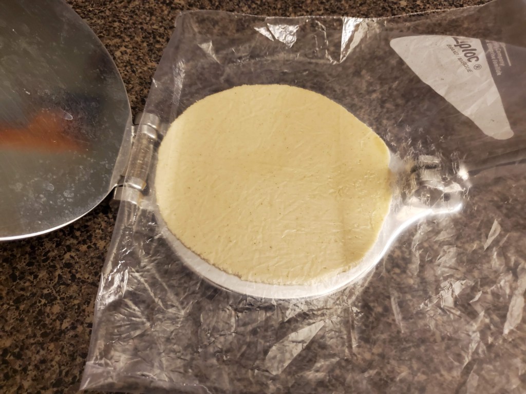 In the above photo, you can see this is in between two layers of the plastic, which helps to manipulate the very fragile tortilla. I like to peel the top layer off, turn the tortilla out into my hand, and then peal off the rest, before resetting for the next pressing. Also note, i didn’t smash this into a molecular paste. You want some width here.