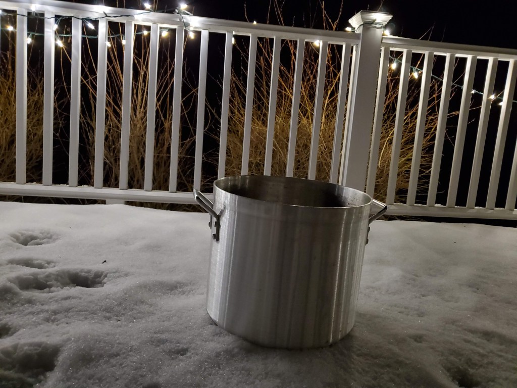 From here, I use a wire spider to get the big chunks, then pour it through a strainer into storage overnight. You can use cheesecloth if you want, but for my uses that’s overkill.