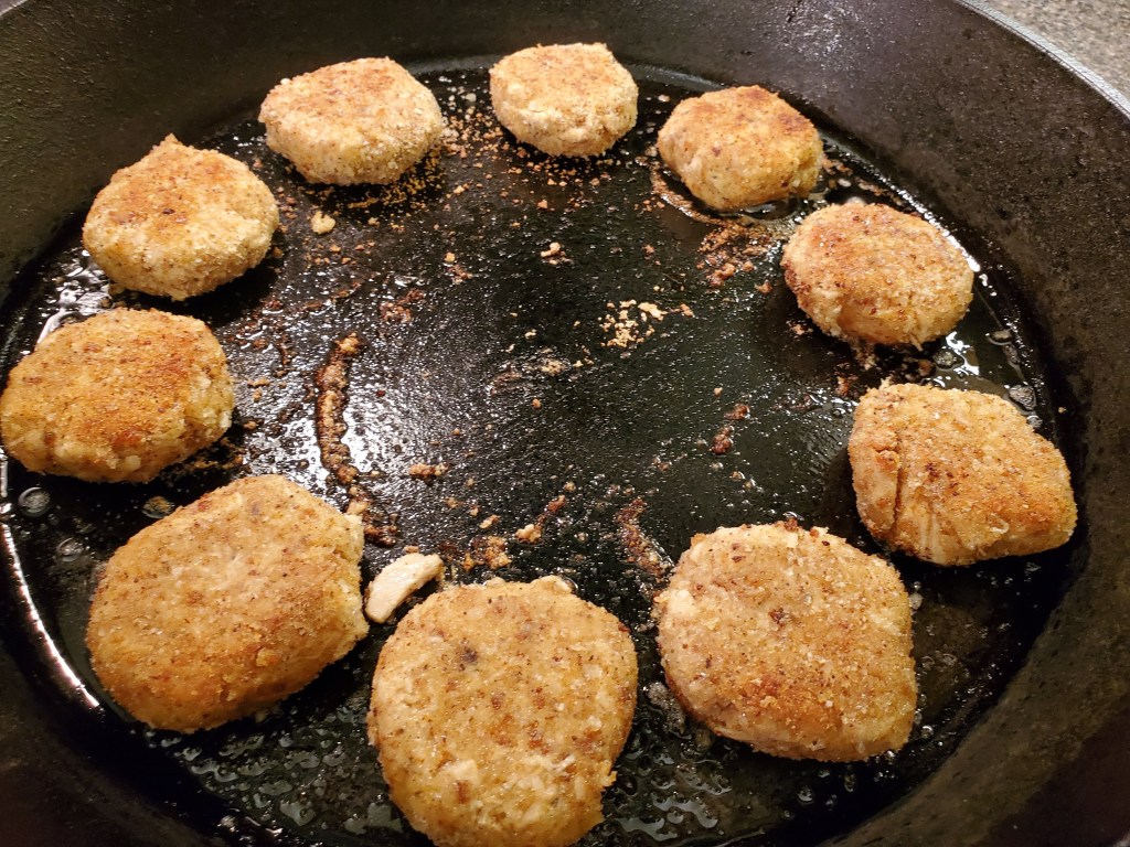 Get the cakes in the pan, and move them around a bit to make sure they’re not sticking. Cook for about five (5) minutes, and flip, keeping an eye on your heat to avoid over-browning (burning). Cook for another four (4) minutes and start temping with a probe thermometer. You’re looking for 140F or so at the very center.