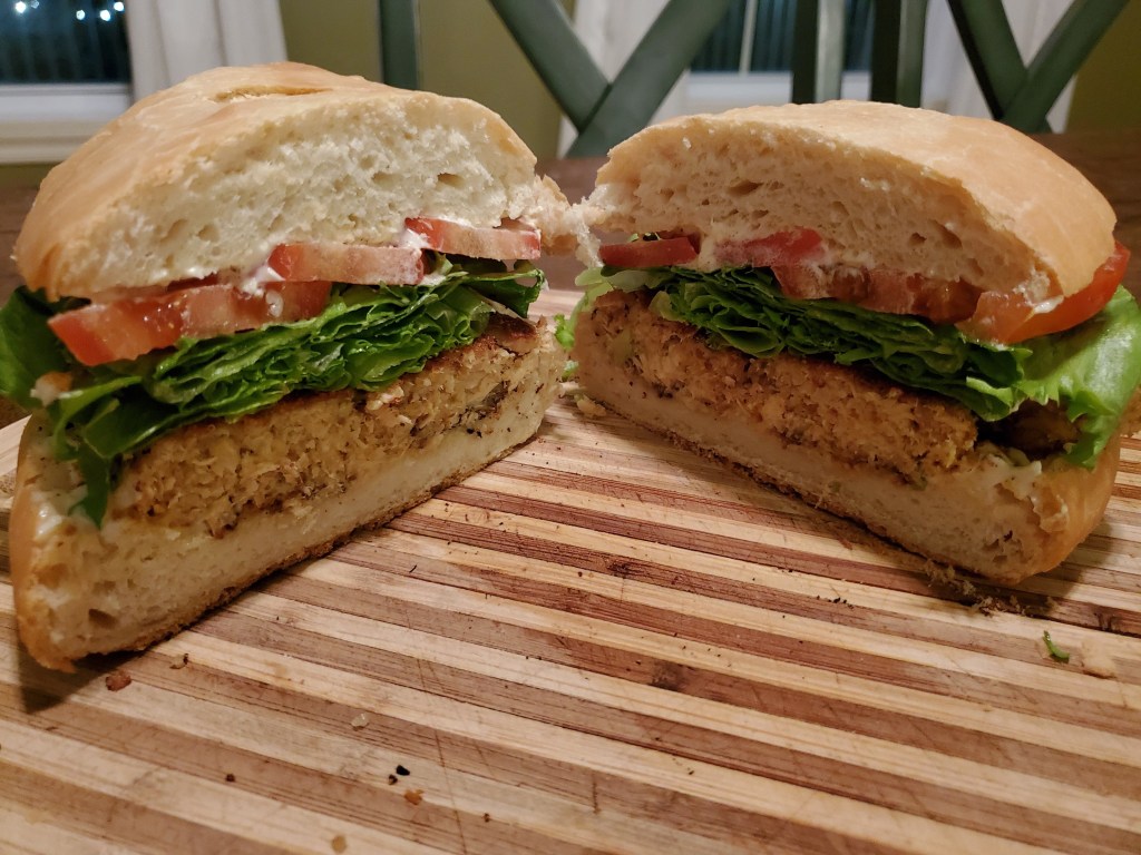 In the interim, split your bread. You can toast it in the oven (I do), or not. Get the top and bottom slathered with mayo, then add salt, pepper, and hot sauce directly to the mayo. On the bottom of the loaf, add your cakes, then top with shredded lettuce, then sliced tomato. Add the top half of the loaf, and slice on the bias into manageable hunks.