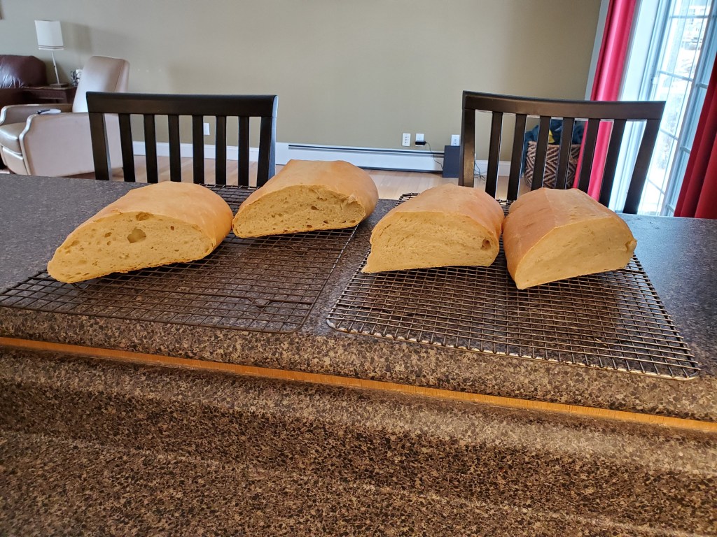 Method: Combine all ingredients and thoroughly knead until it passes the window pane test. Form into a ball and allow to rise until doubled in size (2-3 hours). Divide into two equal parts and shape into long French loaves, and move to parchment or silicon mat-lined baking sheets. Heat oven to 375F, and allow loaves to proof until they pass the finger-dent test (approx 40 minutes). Spray loaves with water, score vertically, and bake for forty (40) minutes. Move to a rack and allow to cool completely before slicing.