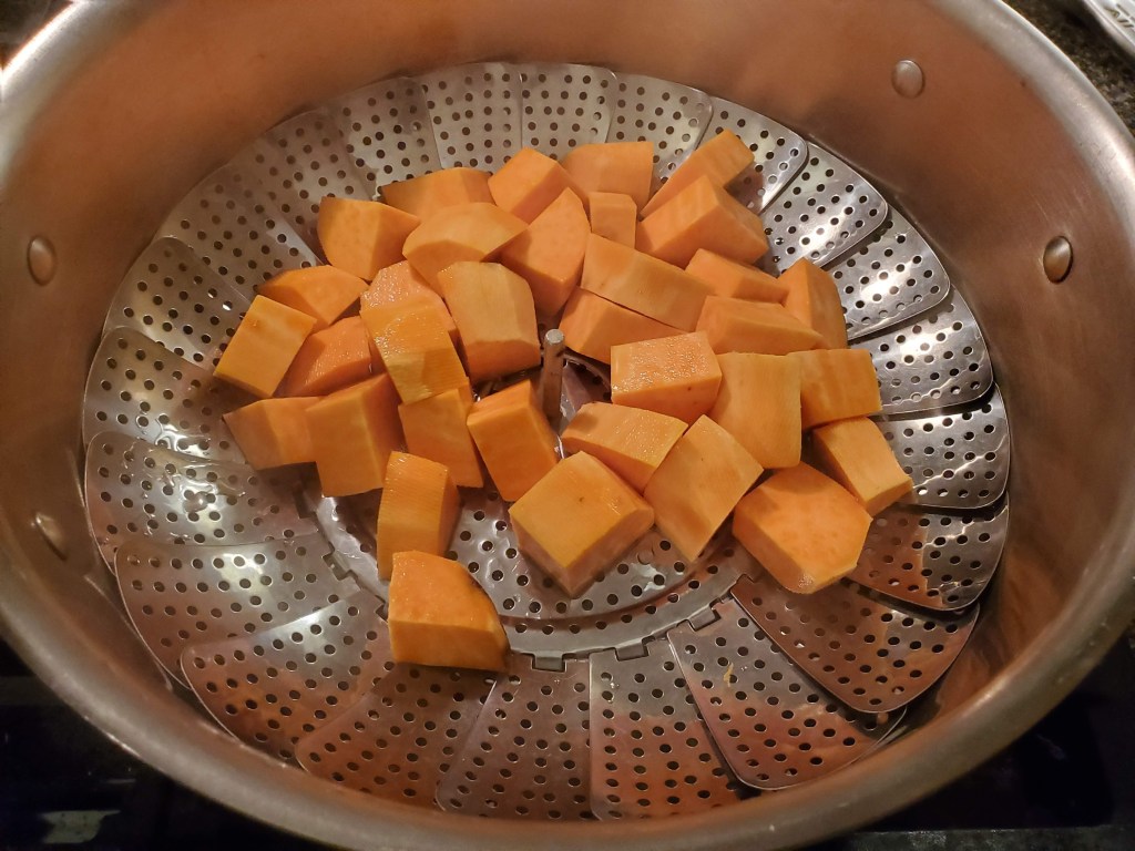 First, par-cook the sweet potatoes to make sure they’re not still raw at the end of the day. I’m using a steamer basket for that: