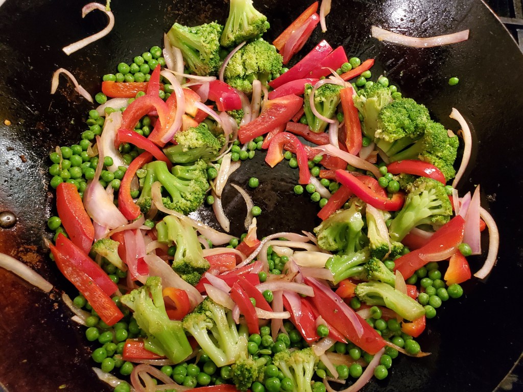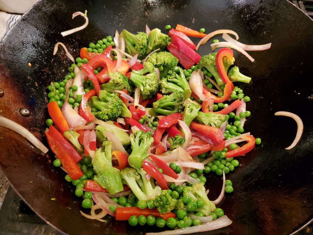 Next, a stir-fry method on the other veggies and aromatics to get them cooked without turning them to mush. If you need a quick primer on indoor stir-fry method, check our post on shrimp fried rice:
