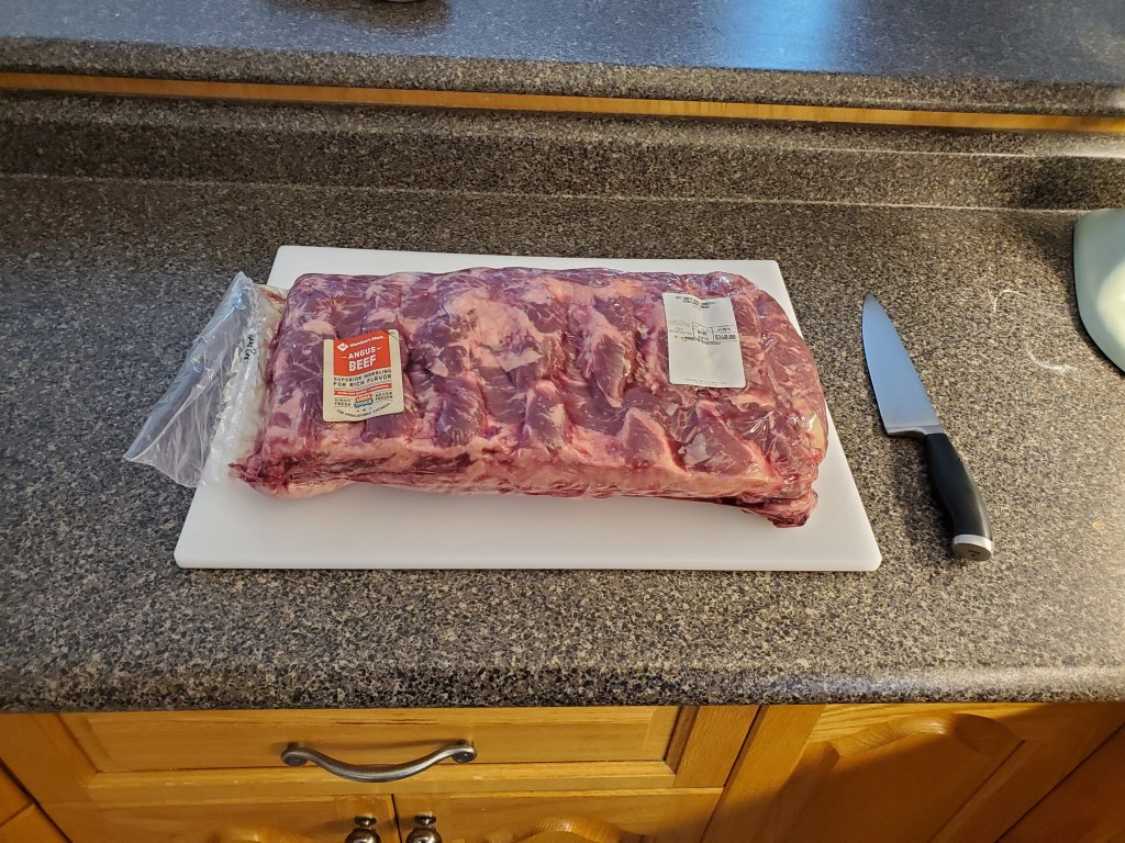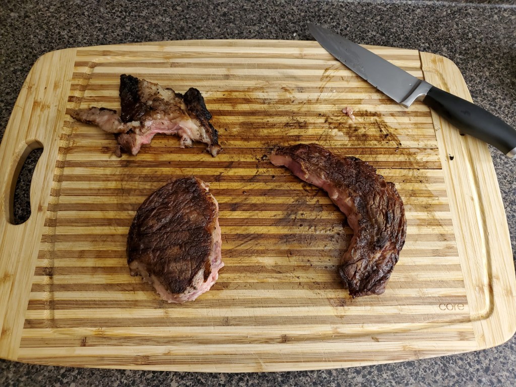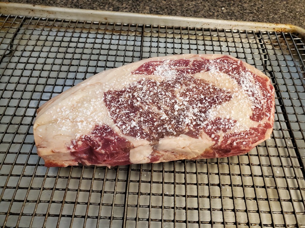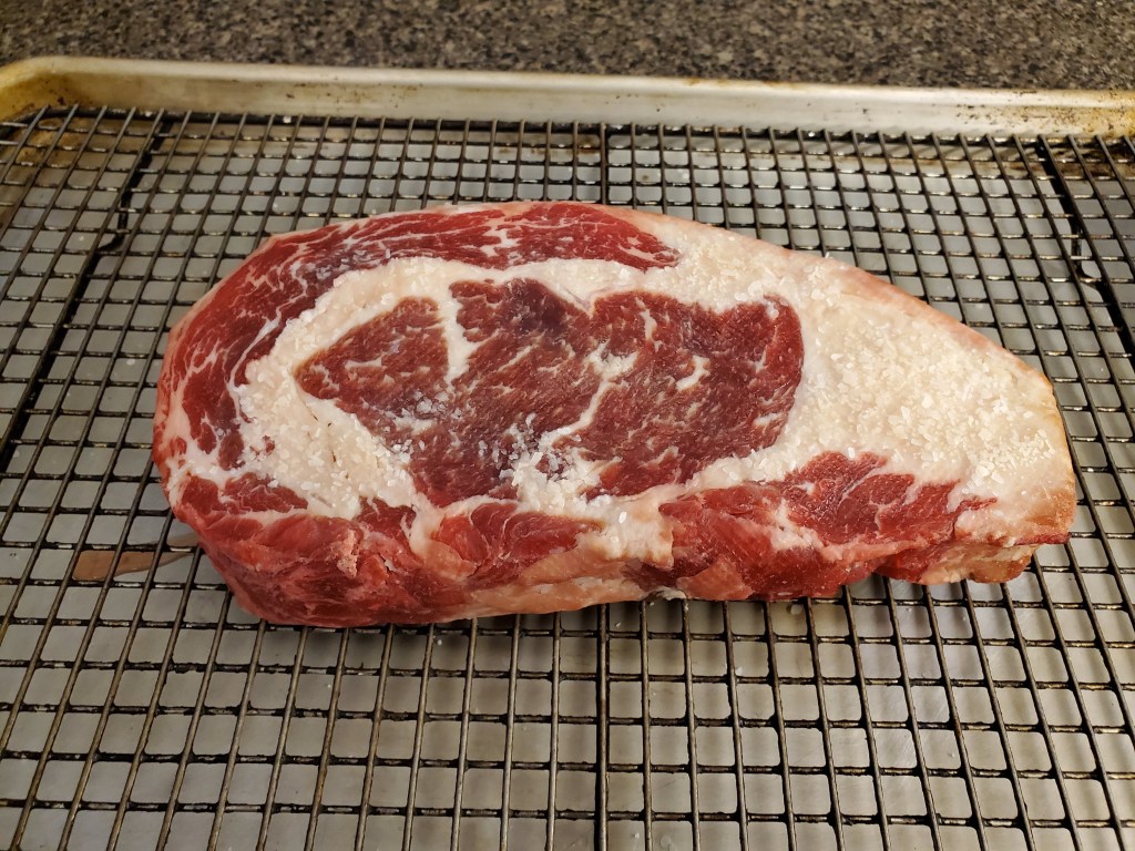 We buy all of our red meat in bulk, and butcher it ourselves. This means a big boneless ribeye primal that we can process into steaks (or holiday roasts) to our liking: