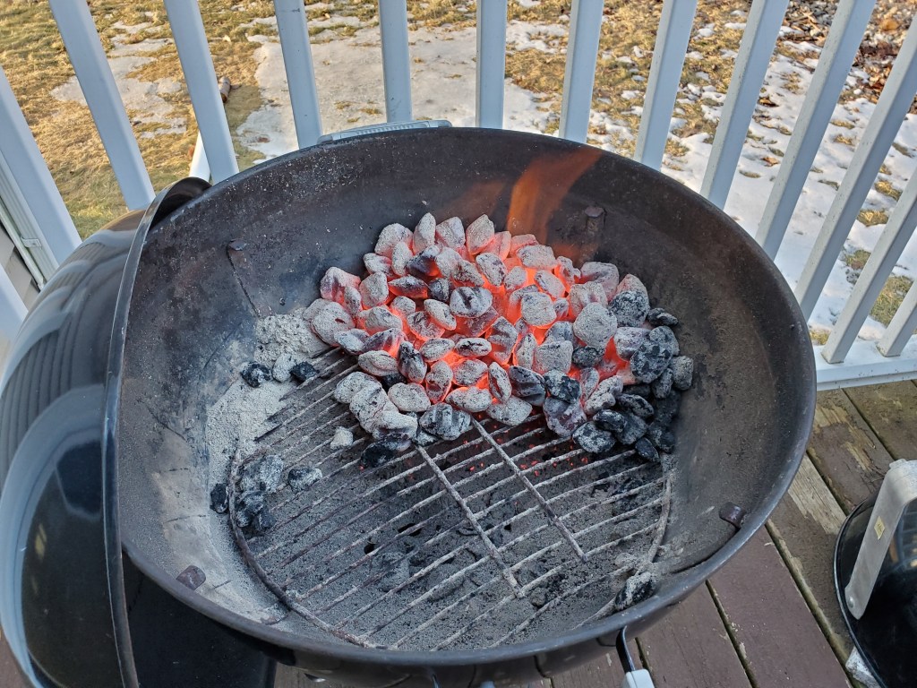 I use charcoal, and if you’re new to it, there’s nothing to be afraid of. I use a chimney starter stuffed with paper towels to get my coals going: