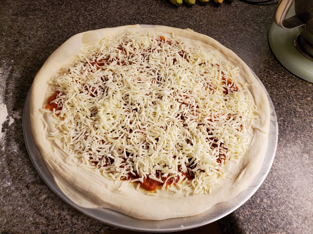 Here’s where the pizza pans/sheets really help. Once the pie is down, you can build your pizza without worrying about trying to slide it on and off a peel.