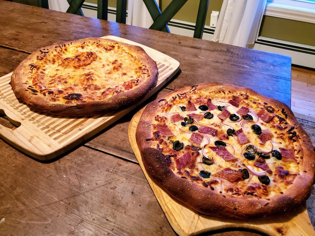 Okay, lastly, if you want, give the crust a brush with olive oil and hit it with some garlic salt and Parmesan (if that’s your thing, which yes, it is). Into the oven for fifteen (15) total minutes, but swap the positions at the halfway point. Remove to a cutting board, let them sit for a minute for the cheese to set, then slice and serve and, if you’re like me, start making the next two pies while remembering that Leonardo is the best ninja turtle.