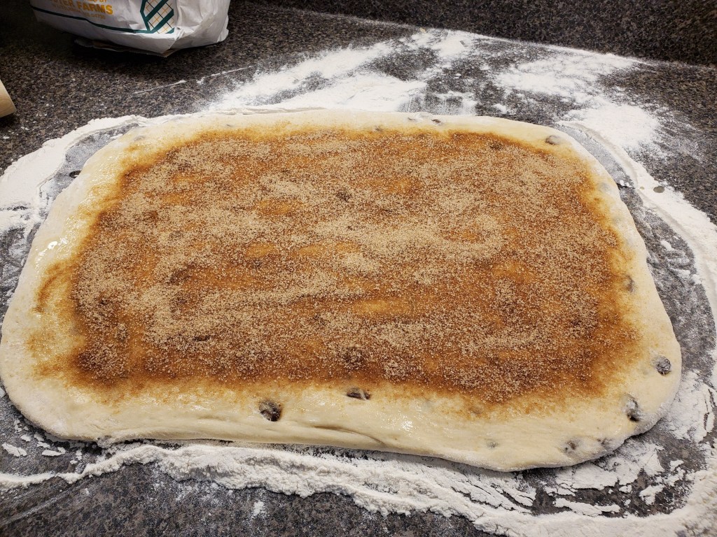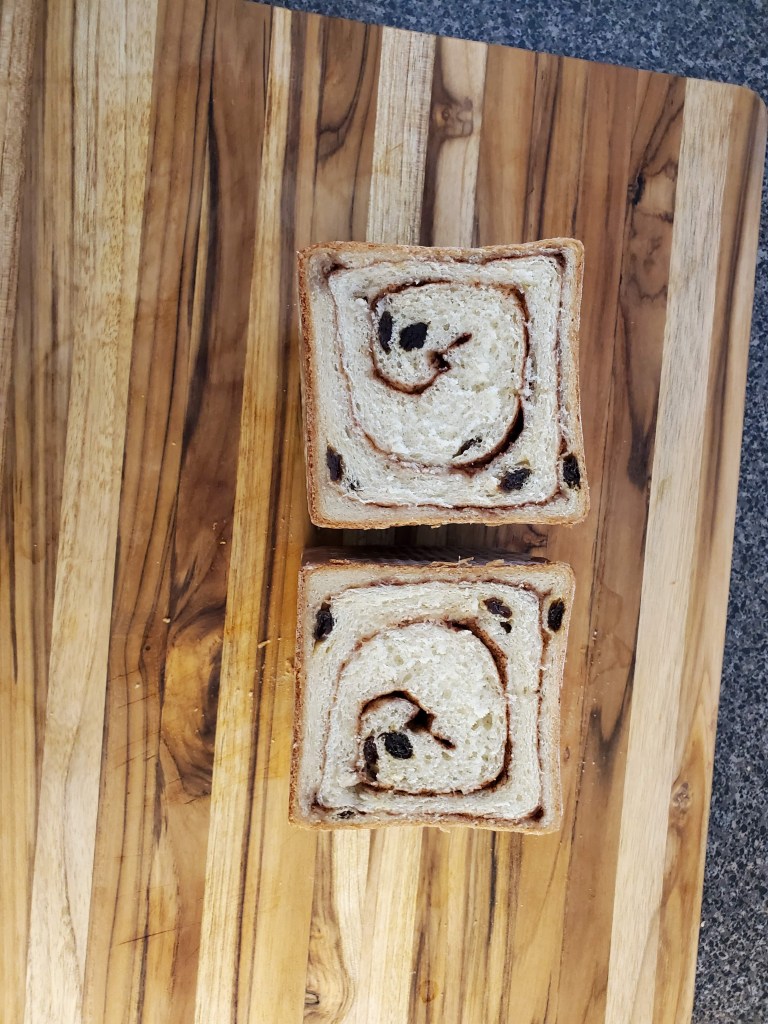 Method: Combine the ingredients (except the raisins) and mix until sticky. Add the raisins, and turn out onto a floured work surface, then knead until near window-pane test. Allow to rise until doubled in size, two (2) to three (3) hours. Turn onto a floured work surface and roll into a rectangle. Brush with oil and sprinkle with additional cinnamon and sugar, then roll jelly-roll style and move to a loaf pan. Allow to proof until finger-dent test, and bake for one (1) hour at 365F, or until the center of the loaf registers 205F. Remove to cooling rack and allow to cool completely before slicing.