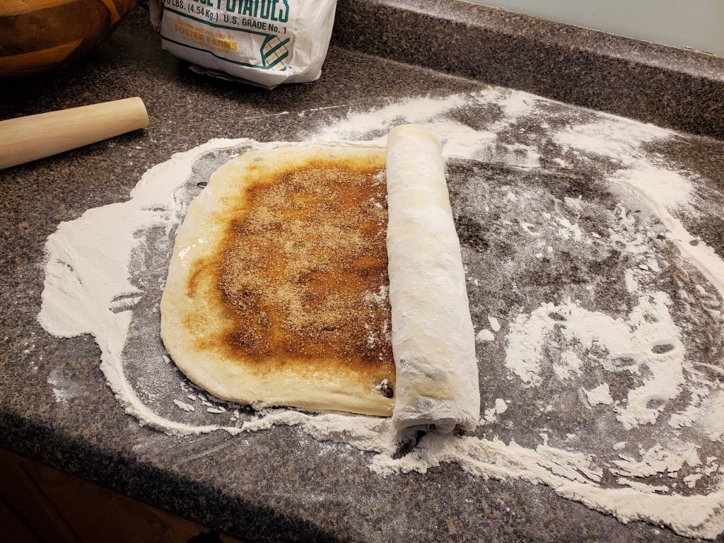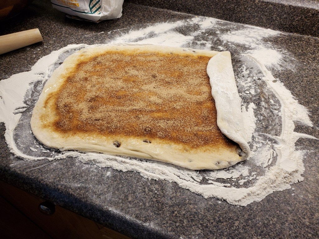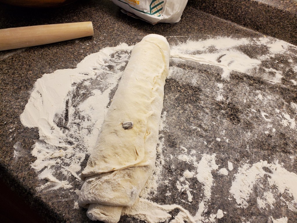Step three: roll it out, then roll it up. Get your dough back onto the work surface, and use a rolling pin to roll it out into a rectangle. You don’t want to go ultra-thin here, or else you’ll have a thousand swirls that will all fall apart. You also want to make sure to fight the propensity for this to become an oval; we’re going to roll it up, and you need an even shape to avoid a final loaf that’s too thick in the middle: