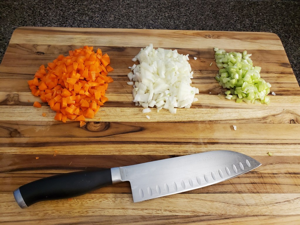 Step one: dice your aromatics. This is the only important step in this process; you need to pay attention to your cuts here because this isn’t going to be a puree, so make sure these veggies are pea-sized now: