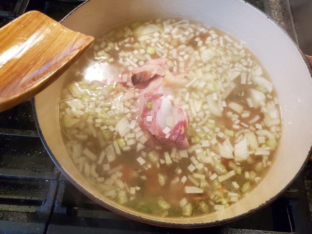 Step two: everyone in the pot, and cover with at least two inches of water. That’s it. There’s no sweat of the aromatics here because the long cooking time would reduce pre-sweat mirepoix to mush, and I want some texture at the end of the day. We’re also not using a stock, so I want the water to do the heavy lifting of flavor extraction from both the veggies and the ham bone: