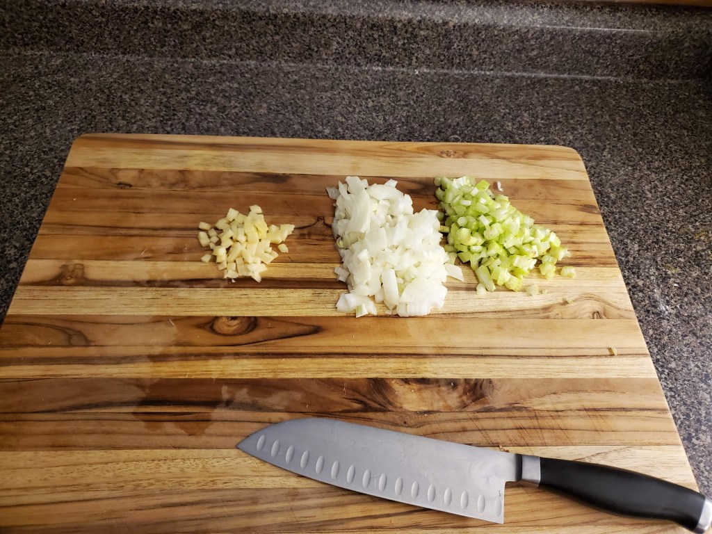 I’ve also minced my ginger here, because why not, but it isn’t going in with the first aromatics; it’ll wait and join the party with the carrots. Speaking of: