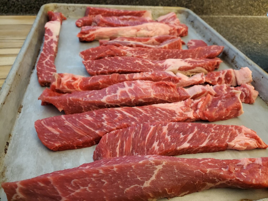 One roast, sliced into strips, and set for the freezer for half an hour to firm up for the grinder. Speaking of: