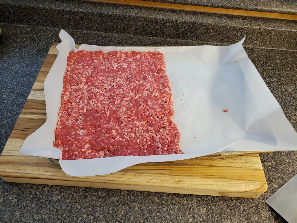 I like to press the beef into a cookie sheet lined with parchment paper, which helps get a nice, thin, consistent shape: