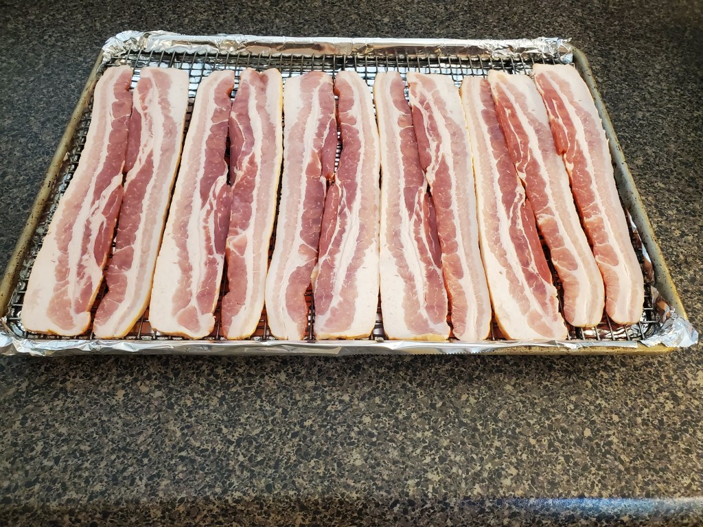 Next up, go ahead and cook your bacon however you want. Personally, I like doing it at the same time as my potatoes, on a sheet pan and wire rack in the oven: