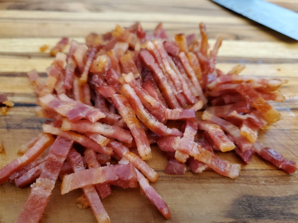 Once the bacon is cooked and drained, slice it up into little ribbons: