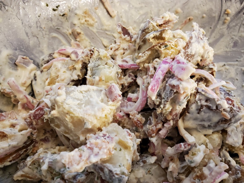 Method: Cut the potatoes into bite-sized pieces, toss with oil and salt, and roast at 425F until fork-tender. Dice or french the onion, and dice the bacon. Combine the dressing ingredients in a large mixing bowl, and add the potatoes while still warm (but not hot). Add the bacon and onions and refrigerate for at least an hour.