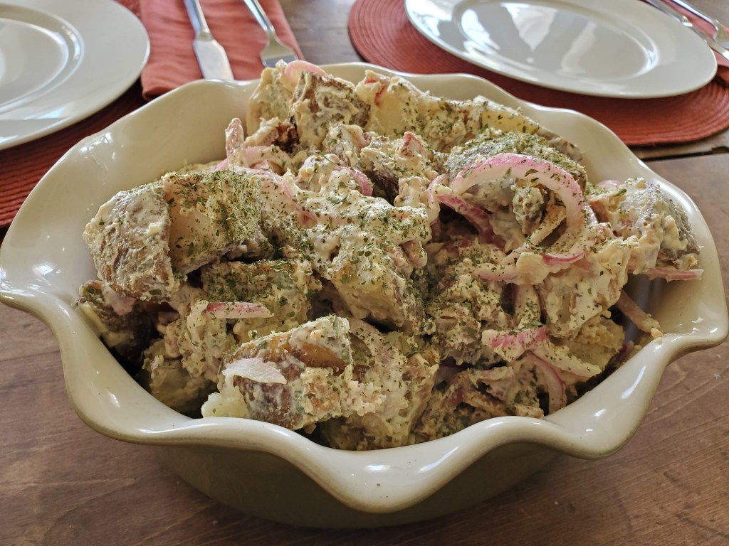 I, on the other hand, lean more toward the German side of things, with a tangy vinegar dressing, and chunks of bacon and onion for extra flavor and texture.