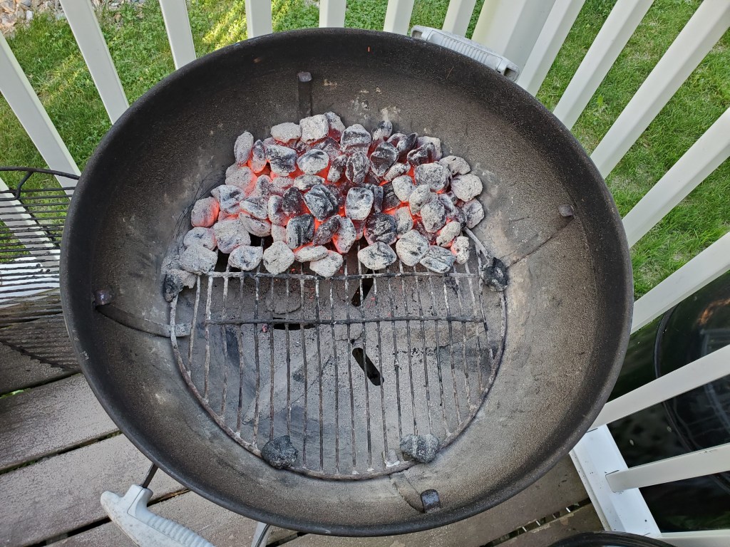 No coals under the chicken, lid on, probe thermometer standing by. Depending on your heat level, grill design, etc, it could take anywhere from fifteen (15) to twenty five (25) minutes to get these up to the temp we’re looking for: 155F internal (which is not fully cooked, but there’s a reason for that).