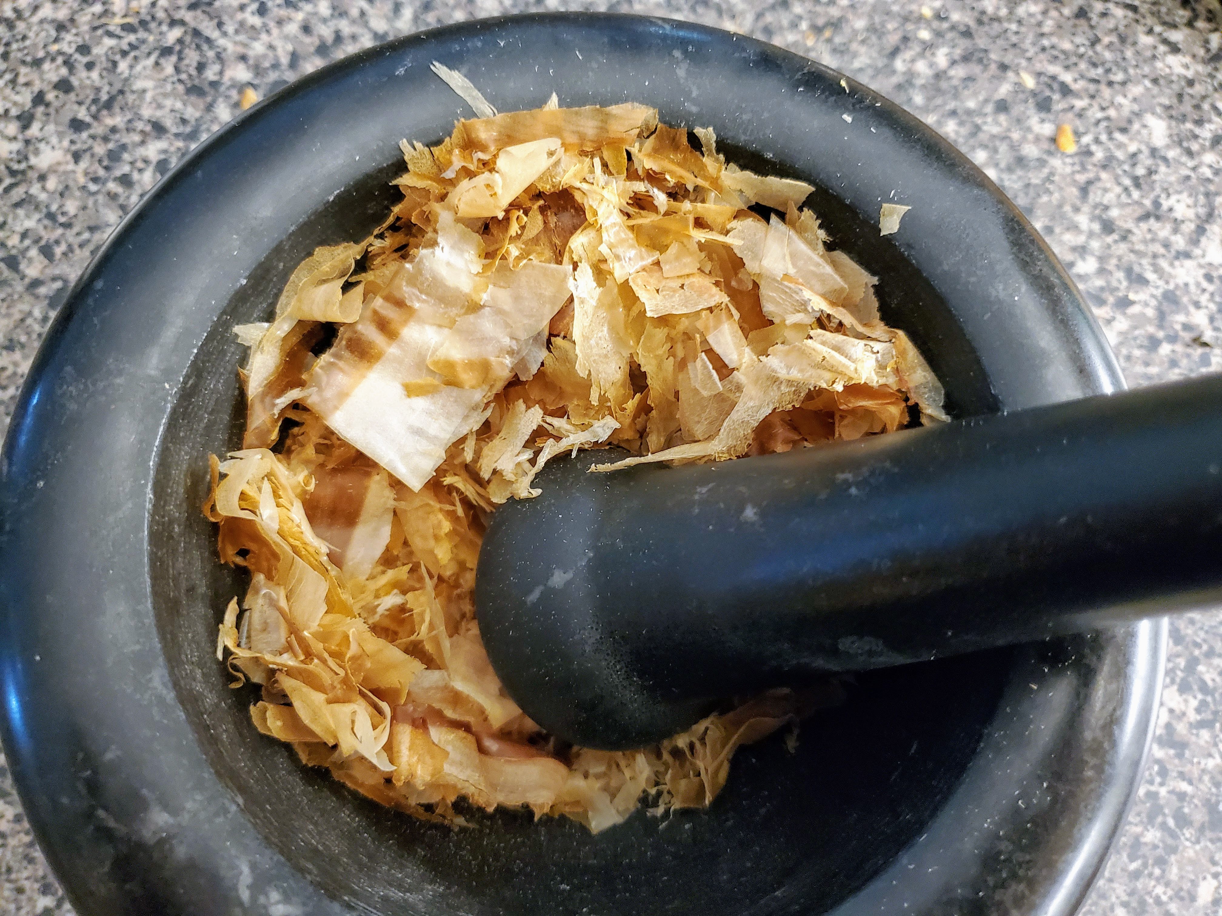 Step two: katsuobushi salt. This part is really easy, and I also keep this stuff on hand at all times. Weigh out equal parts kosher salt and katsuobushi flakes, then grind them together in a mortar and pestle: