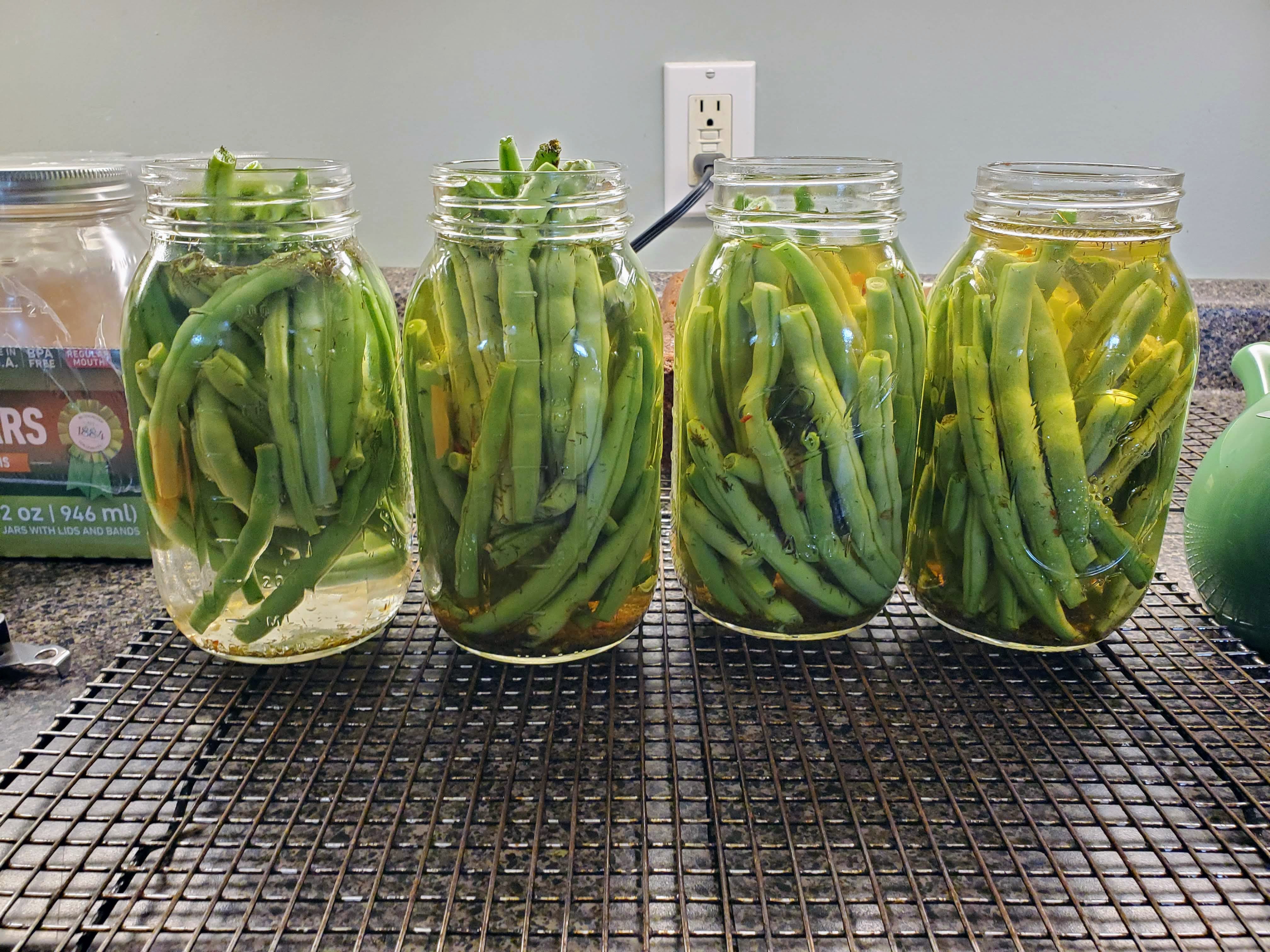 Today I’m putting up some of my green bean harvest, and I’ve decided to make them into spicy pickles (highly acidic!) with a recipe from those good people over at the NCHFP. I encourage you to take a look if you want the specific quantities involved here (which you need if you’re going to be canning).
