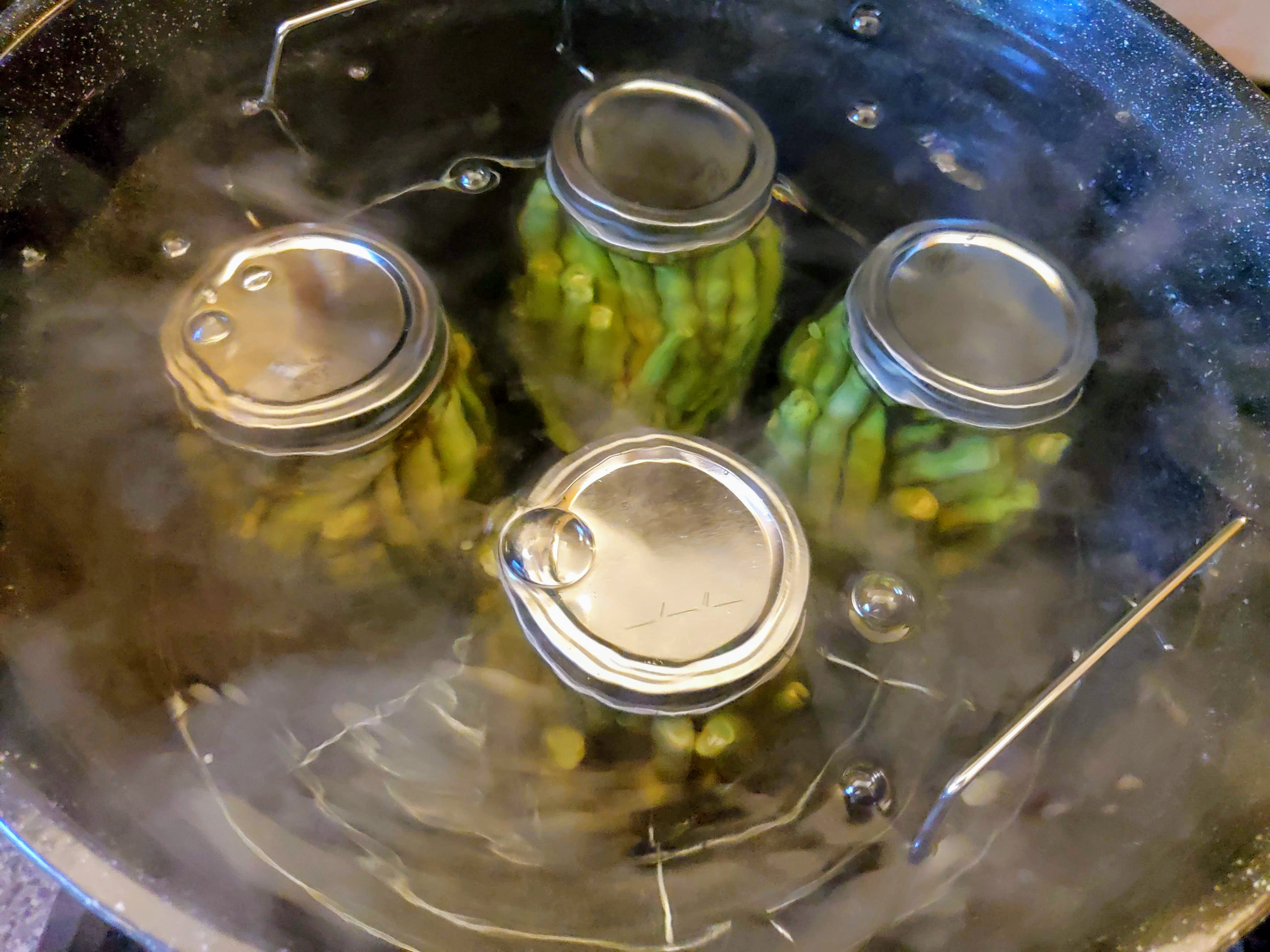 After the designated processing time, move the cans to a rack to cool. If you’re lucky, you’ll hear four “pings” as each lid collapses down from the vacuum effect and locks into place. After that, put them in a cool, dark place until that one winter morning where you need the best damn Bloody Mary garnish on earth.