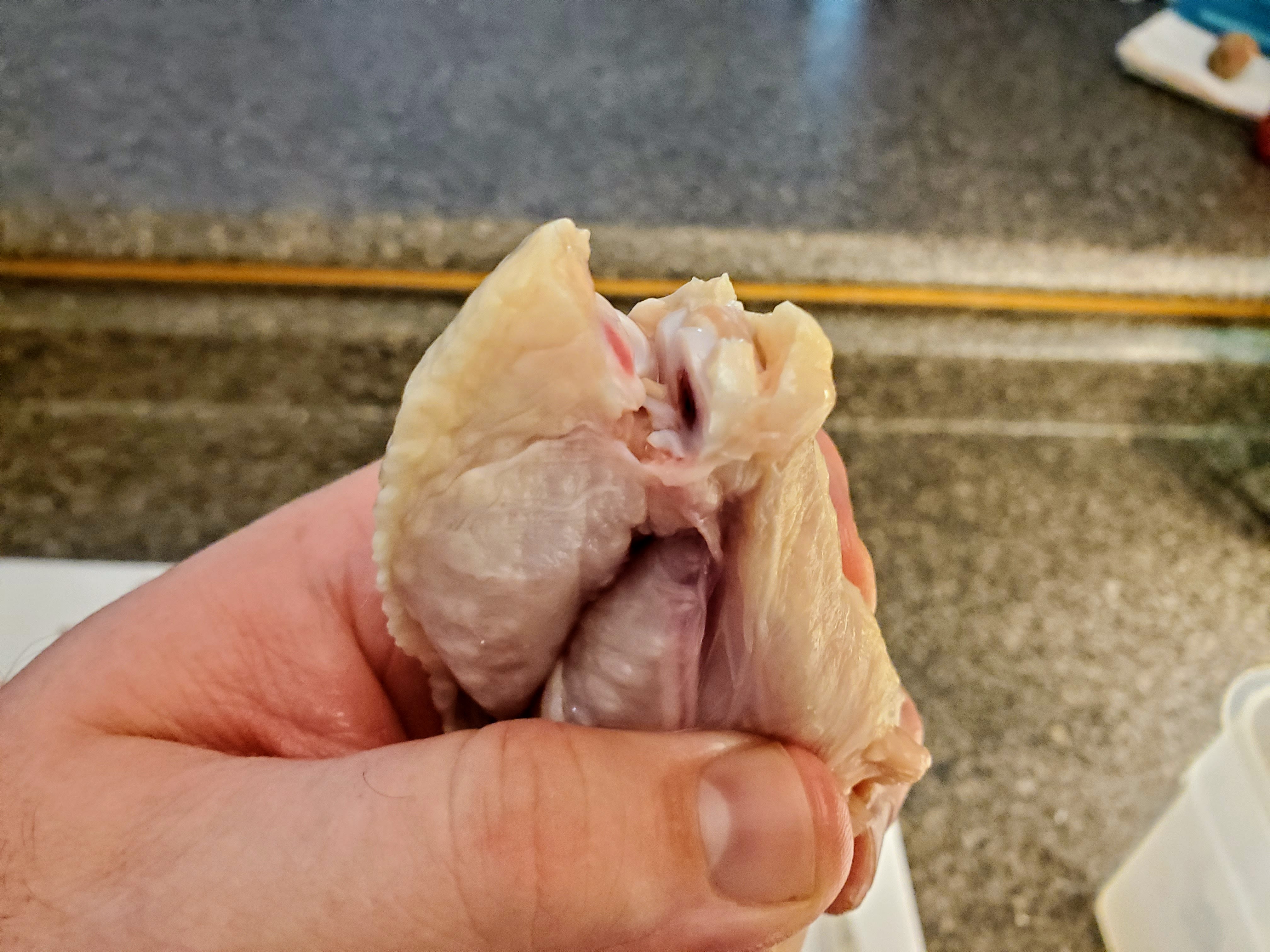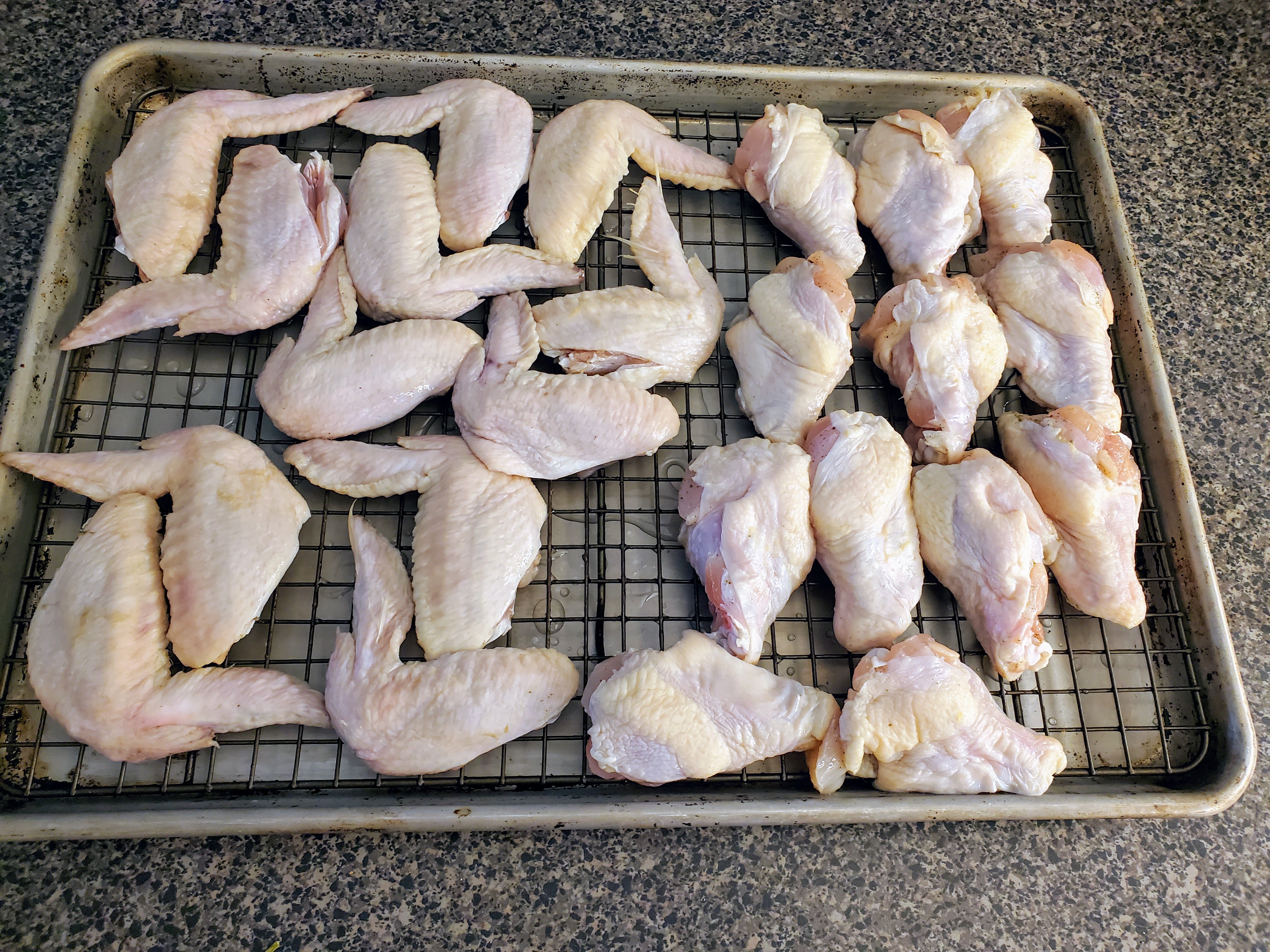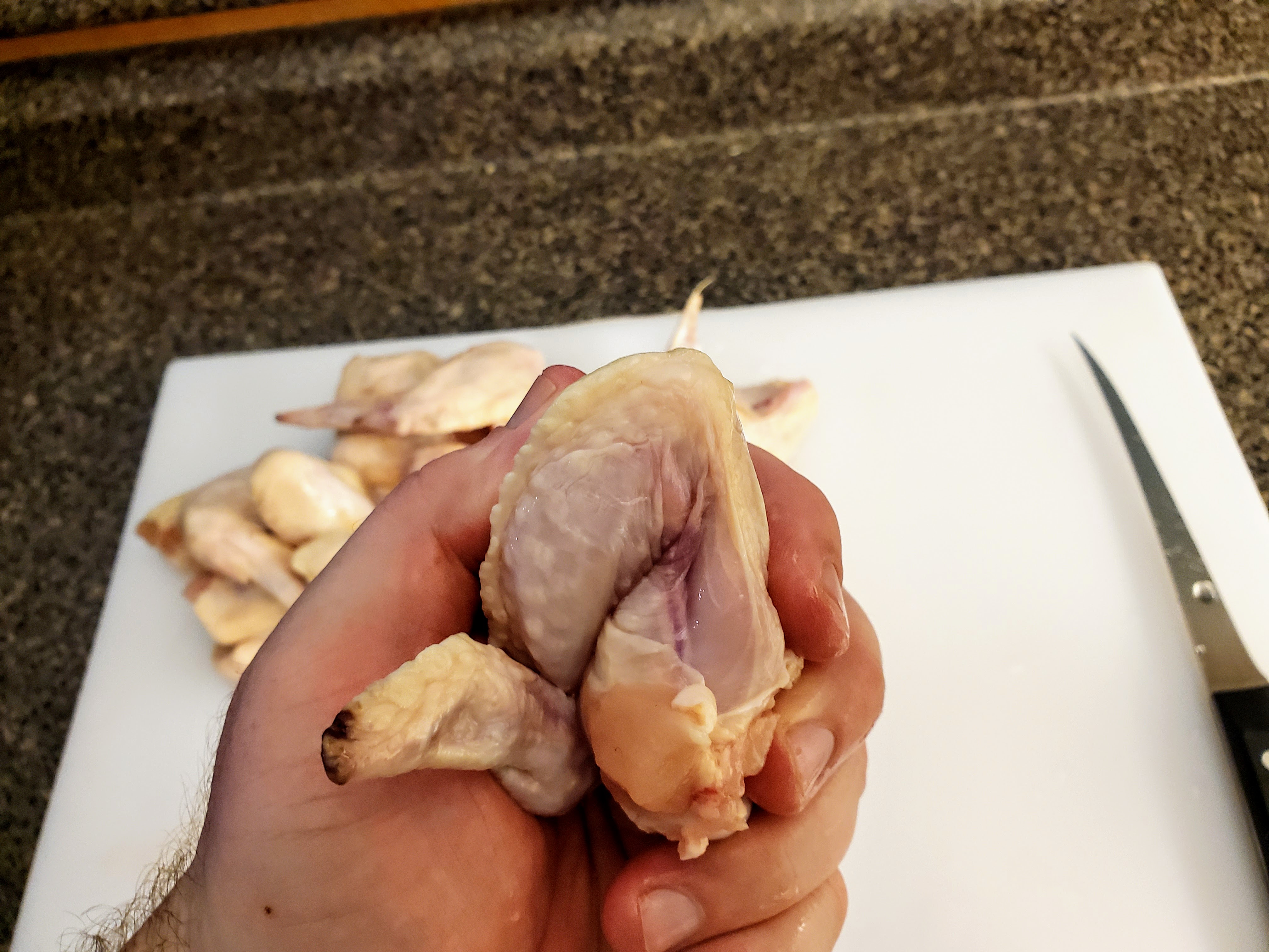 First up, we need to get our wings. You can, of course, buy them pre-cut at the grocery store, which does tend to yield big, plump specimens. But they’ll cost you. Me? Well, as we discussed, I buy chickens a dozen at a time, then butcher them myself. One great side effect is I can bag and store the wings separately, and each chicken run yields 48 wings… so I always have some around.