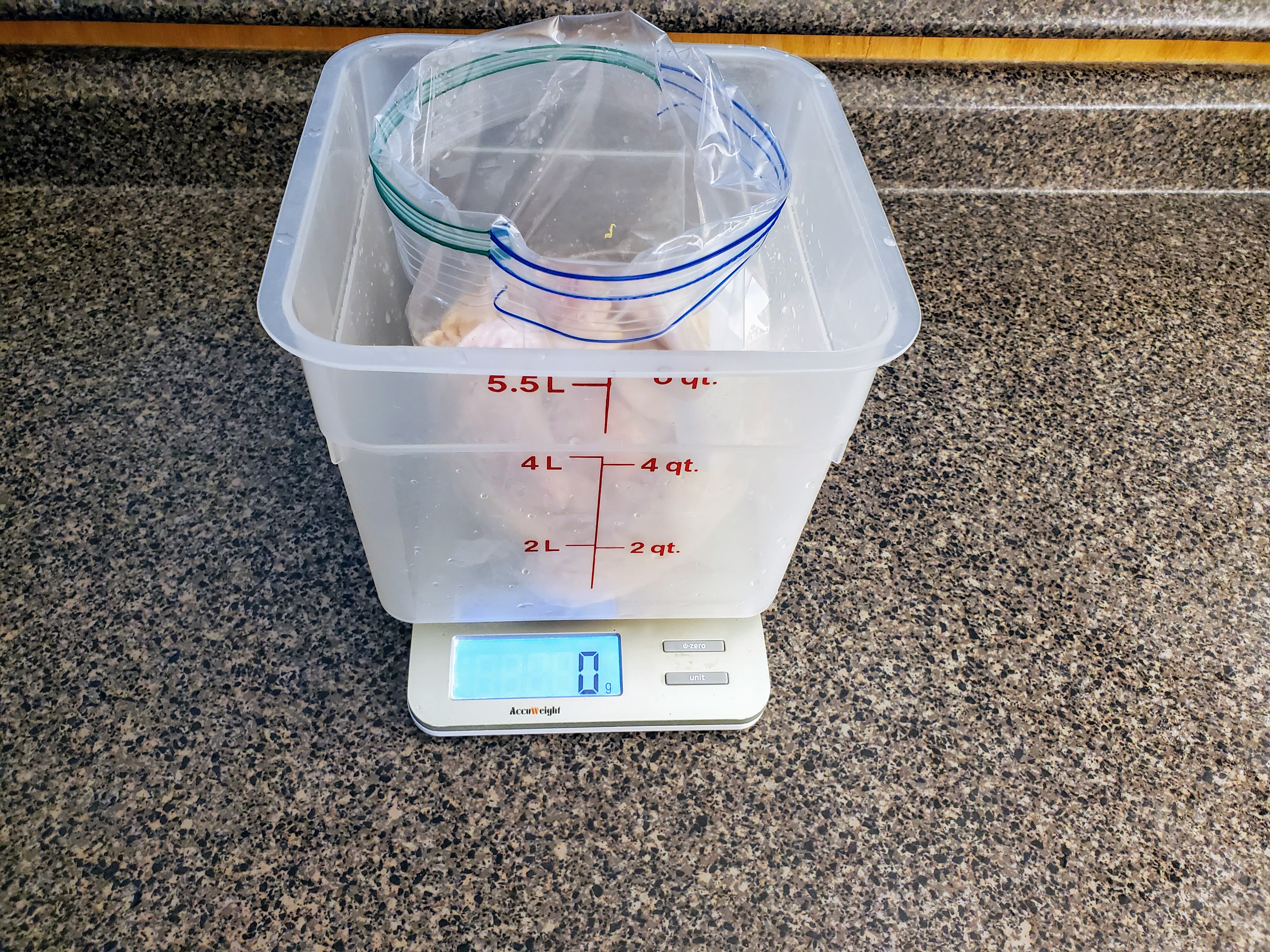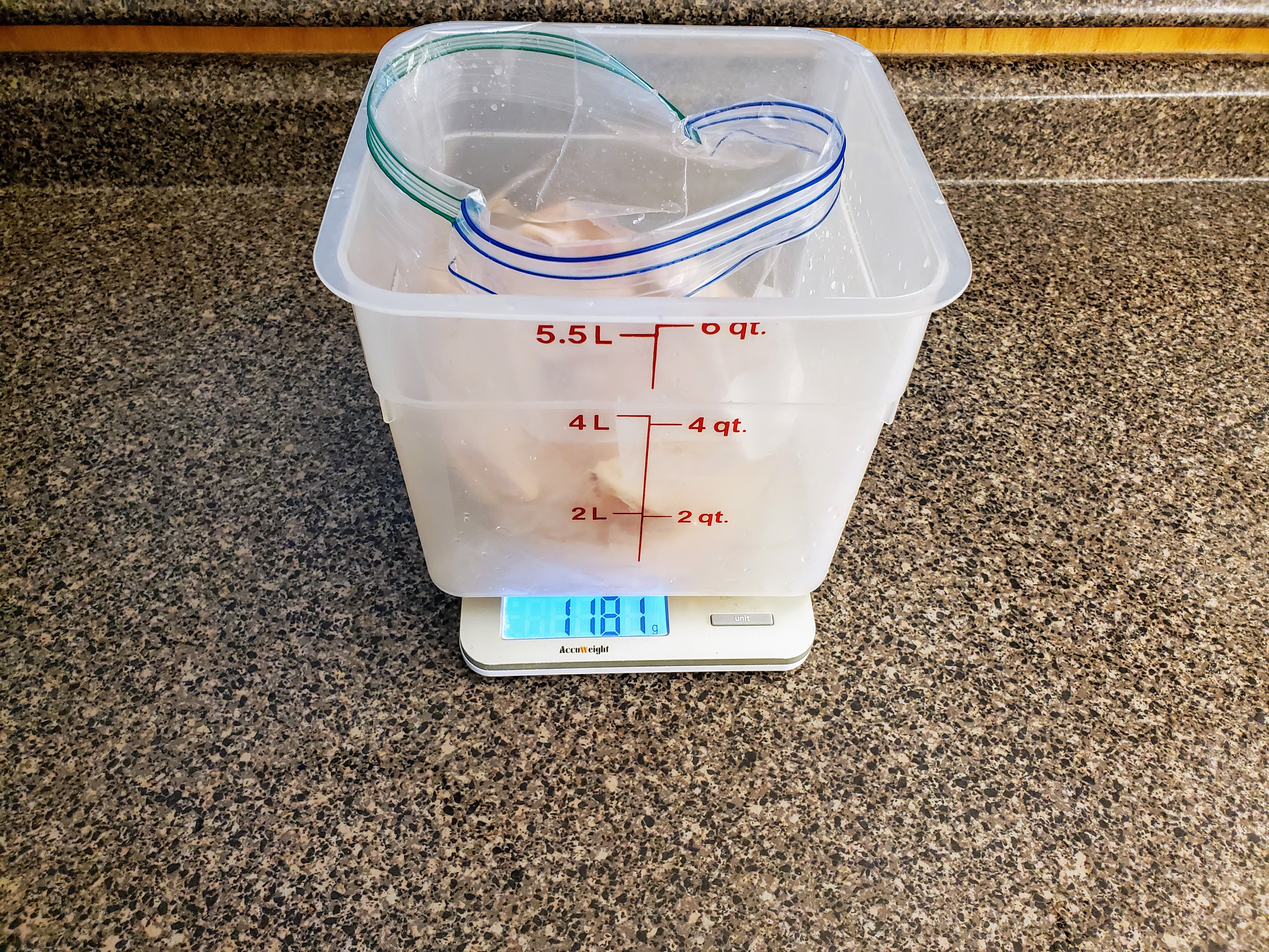 So, for our 6% brine, we’ll get the wings in a plastic bag inside some leak-proof backup (in this case a Cambro) and zero out the scale: