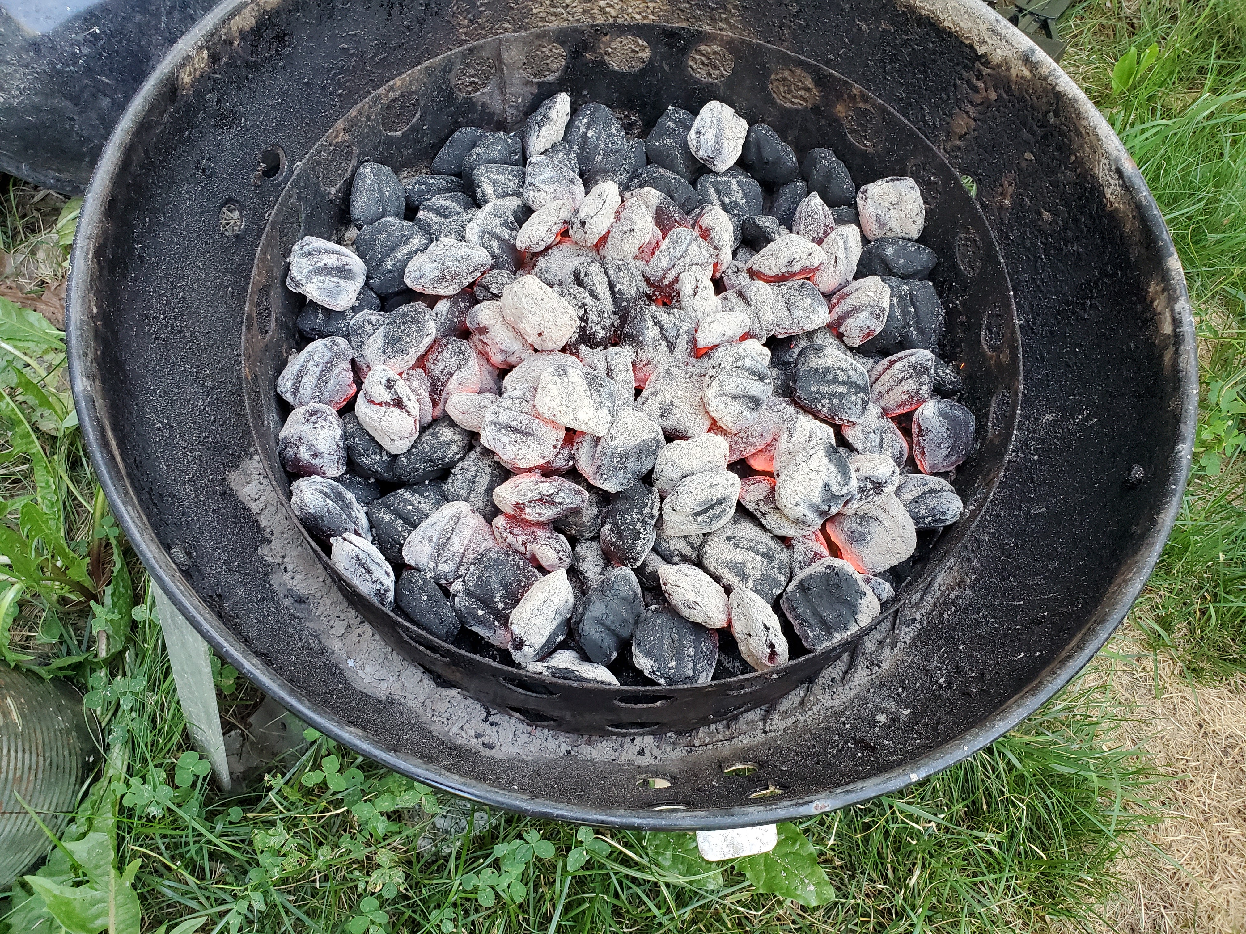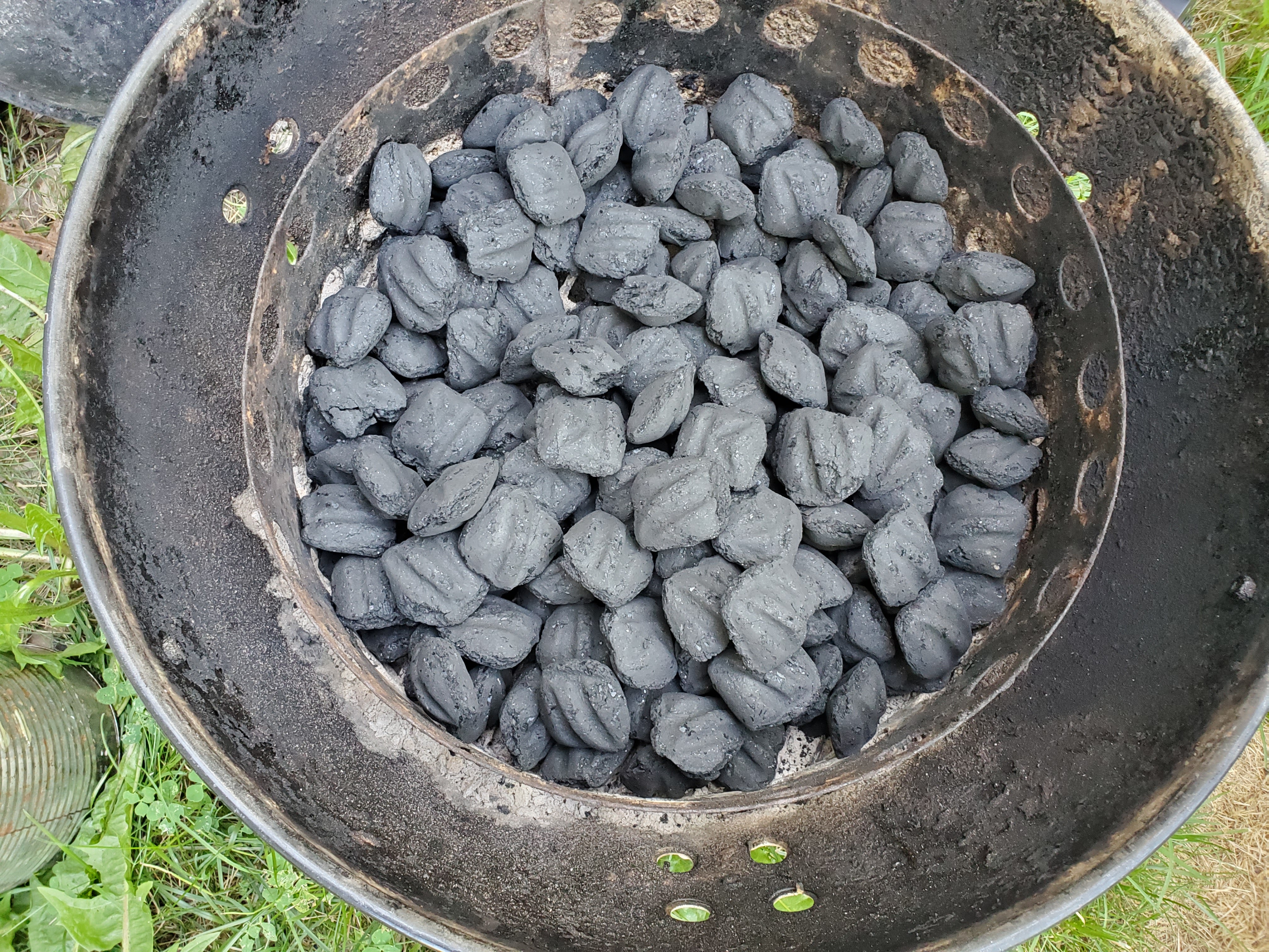The good news is this is the easiest setup we’ve used so far, compared to the “ring of fire” configuration we used for our injected and grilled chicken, or the snake/fuse method we’ve discussed in our pulled pork and PMB discussions. We just need an even bed of coals all the way across: