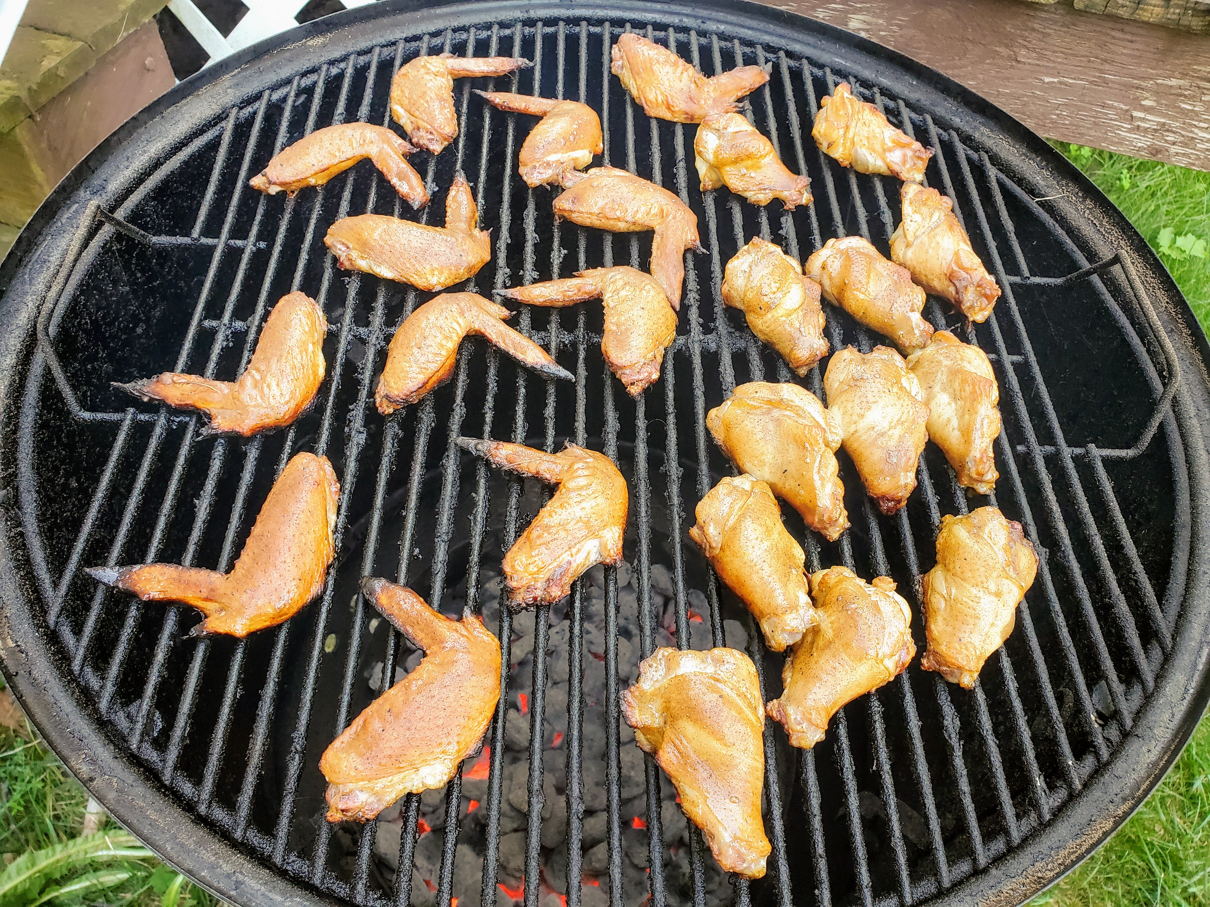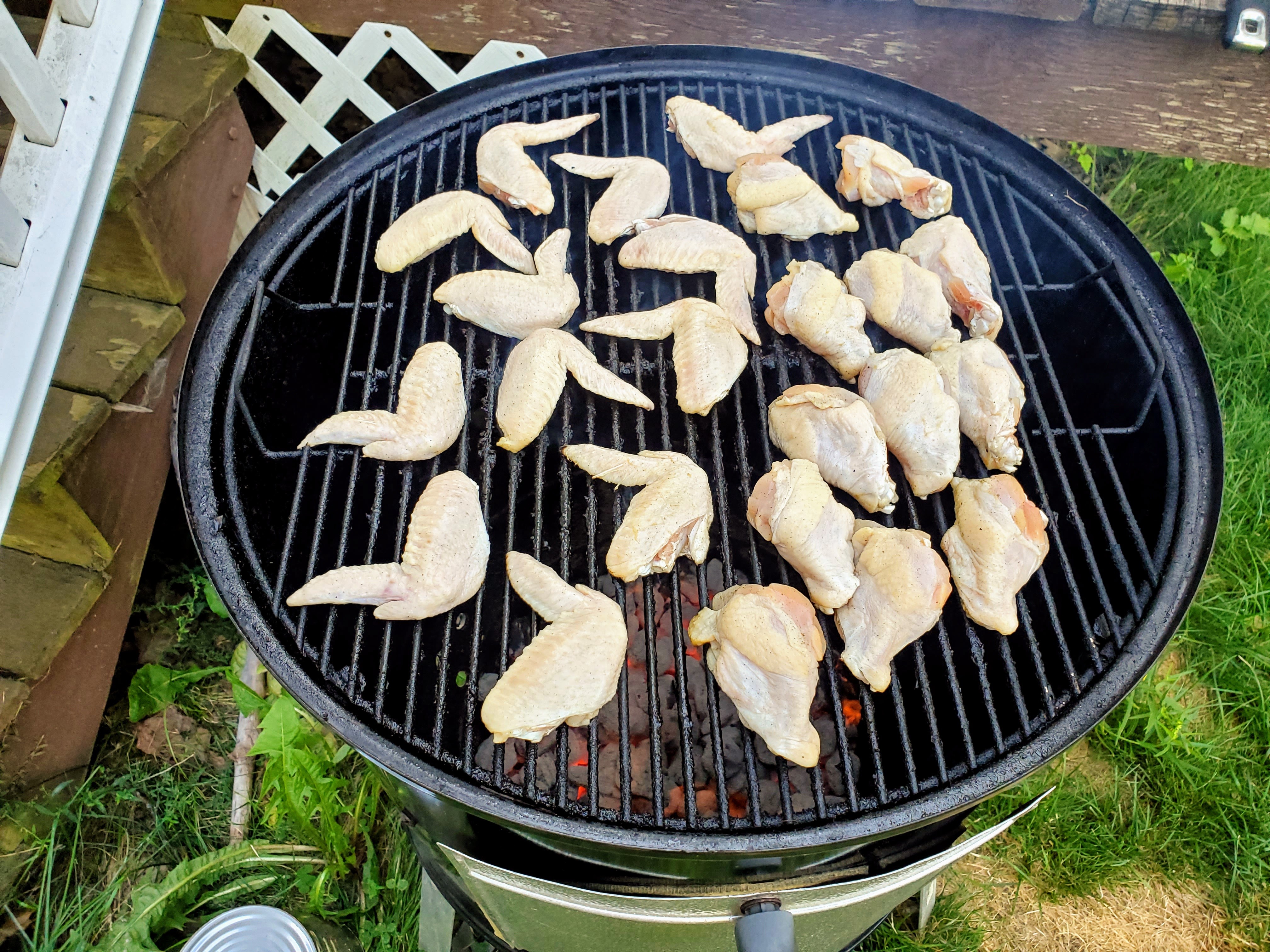 So, yes, you can absolutely do this on a normal charcoal grill, just make sure your coal bed is only one-coal deep, and keep an eye on the wings as you’ll need to turn them twice as often to prevent burning. But for this setup, we’re going to cover with the dome and come back in fifteen (15) minutes to flip.