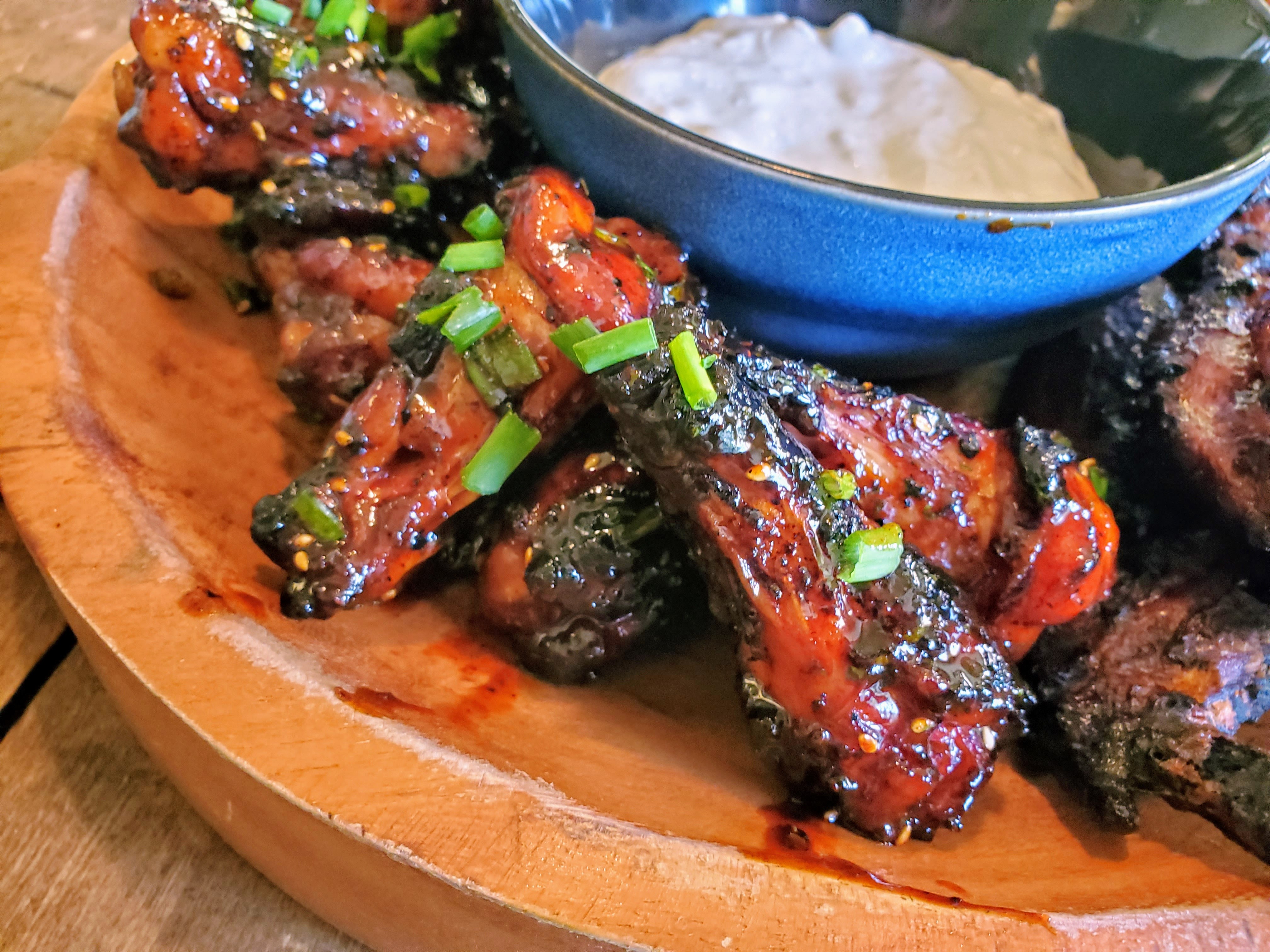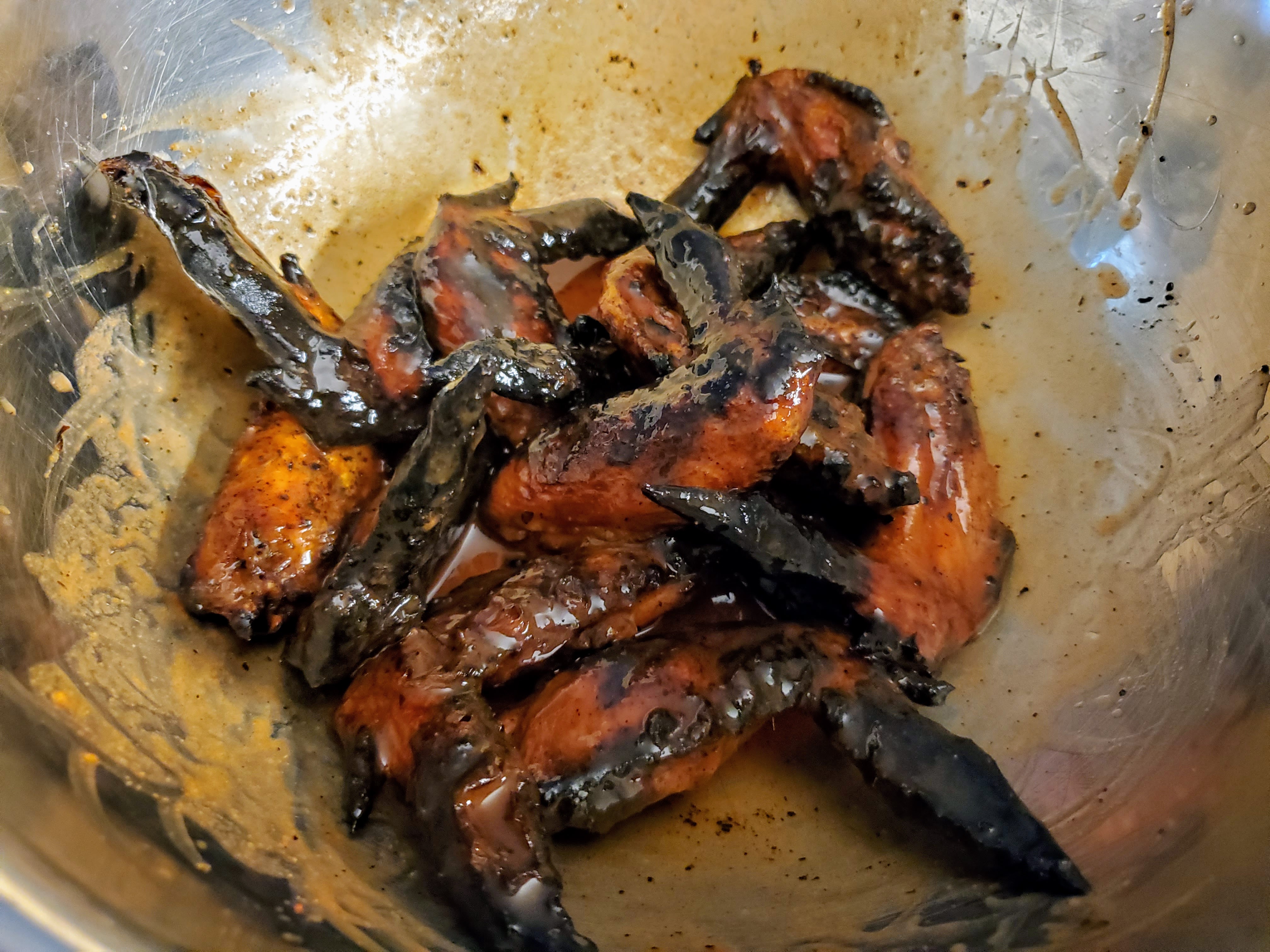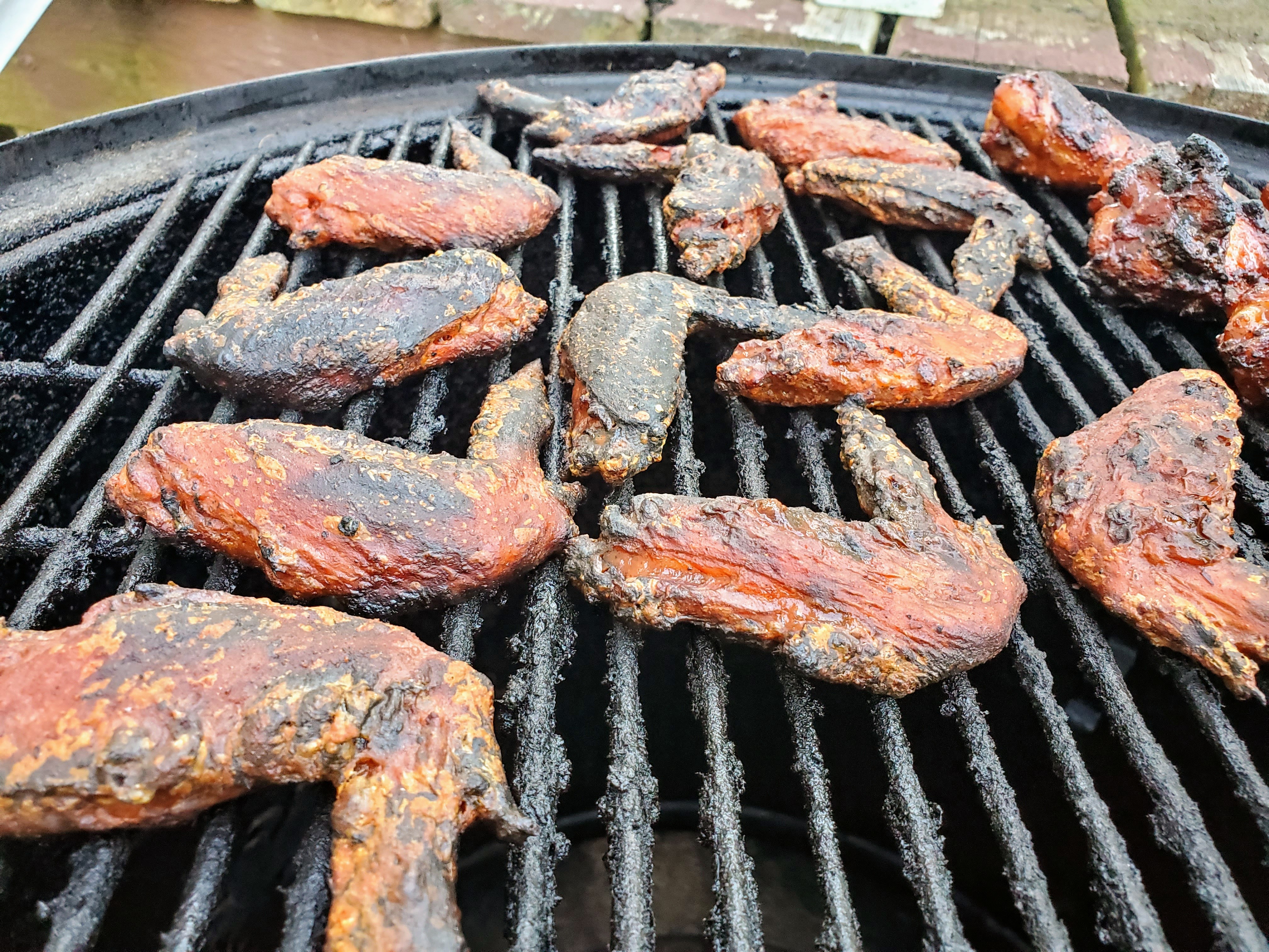 On to the easy part, cooking the wings. At least an hour before cooking, get them out of the brine and rinse it off. It’s potent stuff, delicious in the meat but too strong for the surface. Once they’re rinsed, pat them dry and stick in the fridge until cooking time.